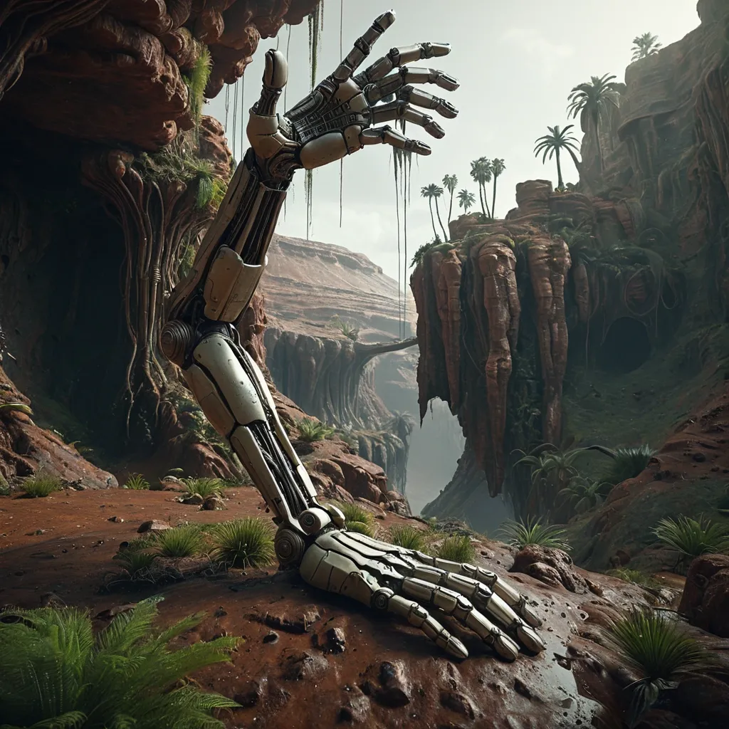 surreal mars land scene where a robotic arm rises naturally upward from the ground , robotic arm extended vertically and wrist gently bent so the palm faces horizontally like a landscape plateau , the palm fully transformed into natural terrain , skin seamlessly becoming soil , moss , roots and vegetation , where a single transitions into a waterfall that fall from mountain on robotic hand's palm and fills the structure of the abandoned fort in a Interference style , total organic fusion between hand and ecosystem , the hand elevated but clearly attached to a real arm and body below frame , photo-realistic textures , cinematic lighting , soft natural atmosphere , environmental concept art , magical realism , ultra detailed , wide shot , depth , 8k ,