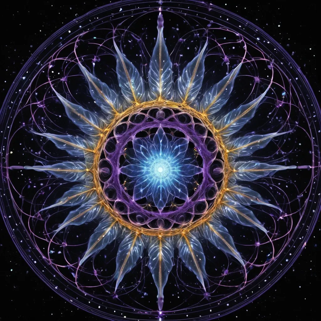 Extreme neuro-mystic visual where a fully clear and undistorted field becomes responsive to a central internal signal. From this clarity , new configurations emerge intentionally , not reactively. The system now creates with awareness rather than being shaped by distortion. Black-violet void , white-perl precise generative patterns , minimal gold as conscious choice core. Ultra cinematic , immersive , Energy flow: • Truth current: Diamond-light beams piercing illusions • Harmony wave: Violet mist dissolving sharp edges - Background: Holographic Schwarzwald merging with nebula , trees made of starlight and silence - Sacred details: » Stork's eye contains rotating galaxy with "Sein" written in light » Cannabis trichomes refracting truth-light into rainbow prisms » Coffee bean cracks revealing microscopic mandalas - Style: Micro/macro cosmic realism , Esao Andrews meets Hubble photography - Light alchemy: » Bioluminescent truth (wavelength 540nm) » Phosphorescent harmony (wavelength 420nm) » Unified glow where spectrums merge (golden-white) --ar 1:1 --detail 32k --quantum_healing ,