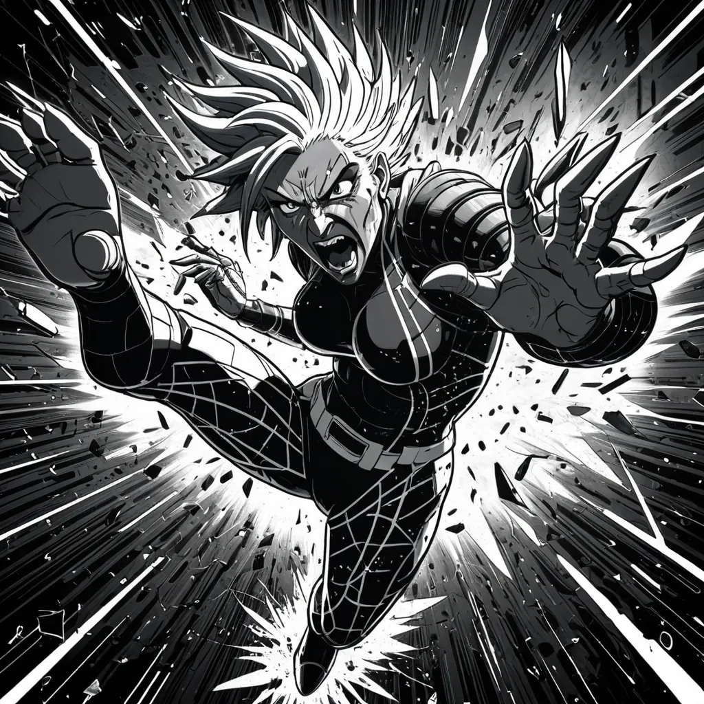A dynamic shonen manga-style illustration of a Indian 52 years old woman mid-flight executing a devastating kick , with spiky gray hair and an intense shouting expression. The small but powerful figure is captured in dramatic foreshortening with their foot thrust toward the camera , surrounded by explosive impact frames rendered in classic black and white scribbles , speed lines , and halftone dot patterns. Shattered rock debris and energy particles explode outward from the point of impact , creating a whirlwind of motion and destruction around the character. The composition uses a tilted Dutch angle with high-contrast lighting that mimics an energy flare , casting hard shadows and emphasizing the raw power radiating from this fierce --ar 1:2 --style raw --stylize 350 ,