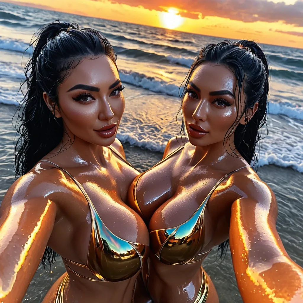 two latinas hyper bronze skin hyper beautiful face that are hyper photorealistic hyper beautiful hyper dynamic hyper full figured hyper curvy hyper hourglass figured hyper slim waist hyper big bosomed hyper busty hyper voluptuous hyper big booty massive thighs posing flirtatiously for selfie , wet tan skin , hyper dynamic one hand selfie aerial shot , Fantastic painting portrait masterpiece by Karol Bak , Zhaoming Wu , Akihito Yoshida , bokeh , beautiful hyper dynamic cleavage , hyper dynamically fondling , hyper lover dynamic , hyper dynamic , hyper perfect anatomy , hyper dynamic zoom , hyper enticing dynamic , hyper flirty dynamic , hyper dynamic one hand selfie aerial shot hyper flirtatiously dynamically posing for selfie pose , arched back dynamic , hyper flirty expressions dynamic , pressed together and dynamically touching each other , skin wet from swimming , hyper dynamic wet dark hair styles , shiny hair , hyper beautiful face , hyper realistic , hyper beautiful face , wearing hyper detailed hyper dynamic hyper revealing bright colored hyper tiny microkini , hyper detailed sunset beach scene background , HD , 8k , photography ,