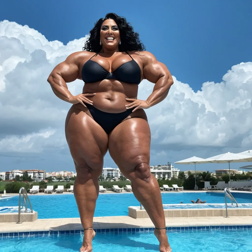 smiling and laughing 8 ft tall , huge , voluminous and thick , muscular , but overweight first grade girl , with long wavy black hair on her small head with beautiful face , with strong and big arms , with very long , strong and big legs , a heavy weight sports champion , bigger than any teacher , towering at a swimming pool under the clouds and the blue sky ,