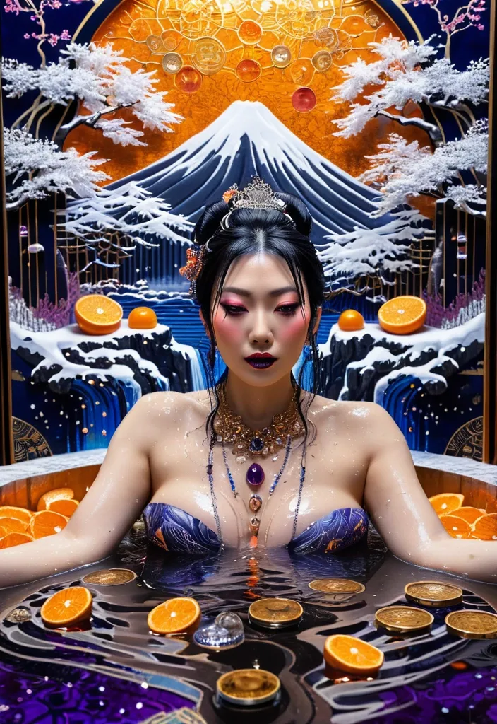 A striking abstract image of a beautiful Japanese girl luxuriating in an ornately detailed bath filled with shimmering treasures , including vibrant jewels , precious silver and gold coins , and sparkling crystals. Behind her , the painted Japanese screen creates the illusion of a cascading waterfall flowing into the bath , all set against a backdrop splashed with deep oranges , rich purples , and soothing blues that seamlessly blend together. Geometric shapes intersect through the scene to enhance depth and contrast , alluding to Trompe-l'oeil art while capturing the stark and harsh beauty of winter's influence. ,