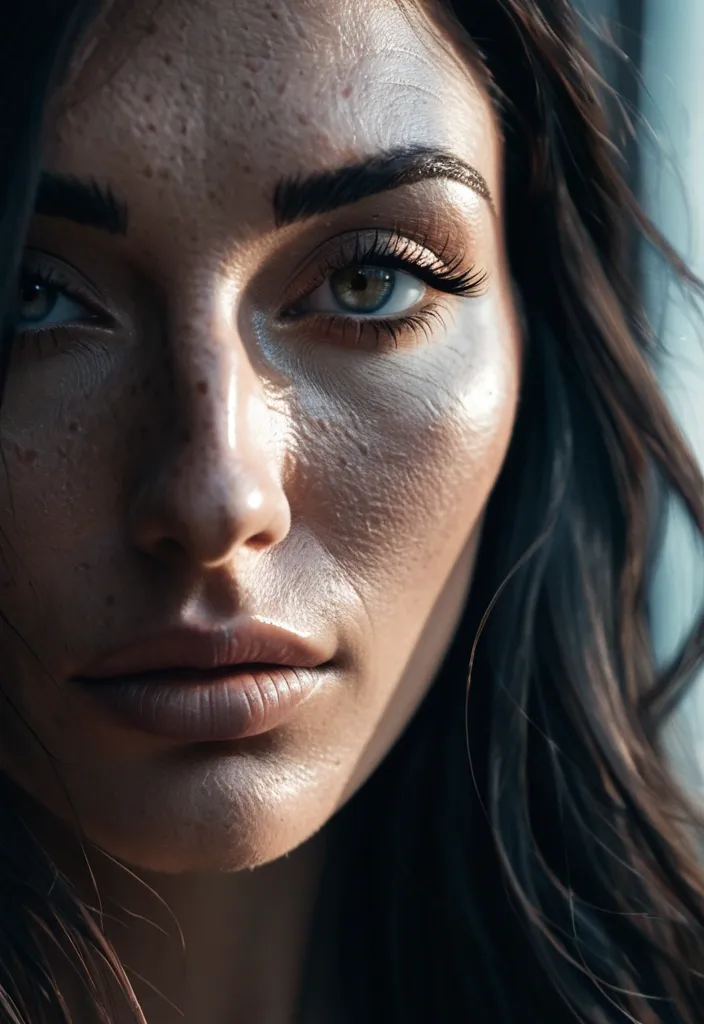 extreme close-up half-portrait of a young woman. Razor-sharp focus on her deeply contemplative eye. and long , wavey hair forming dramatic , harsh , volumetric window-light shadows (suggesting palm leaves or blinds) across her face. Her lips are parted slightly , soft , and natural. Her eyes are bright , cool blue with a hint of grey , slightly almond-shaped with naturally curled lashes and softly defined brows. Her nose is delicate and narrow with a softly rounded tip , clearly adorned with a small silver nose ring piercing on her left nostril , catching the light with a subtle metallic reflection. Her lips are full with natural fine lines , warm rose-brown in color , subtly highlighted by the flash. Her skin has a warm , sun-kissed bronze tone with visible freckles , natural pores , faint veins , and a subtle sheen that reflects the flash realistically. Her hair is deep brunette , long and wavy with curtain bangs , a few realistic flyaways framing her face , humidity-reactive strands catching light. The entire right side of the image , background and all , falls off into deep , creamy , dreamy bokeh blur , with extremely shallow depth of field and subject isolation. Arthouse movie-like , minimalist , profoundly melancholic , haunting atmosphere with subtle film grain and minimal vignette. ar-3:4 ,