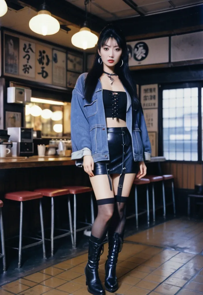 Beautiful Japanese girl in 1980s Japan , long dark hair with purple highlights , wearing oversized denim jacket over black dress/top , black mini skirt , dark stockings/tights , black lace-up boots , silver hoop earrings , cross necklace , standing pose in a vintage 1980s Japanese coffee shop/café with retro interior , warm ambient lighting. Vintage film photography aesthetic with heavy film grain , light leaks , analog camera imperfections , scratches and dust on film , faded colors , nostalgic 80s Kodak film look , slight overexposure , authentic Japanese 1980s fashion and styling ,