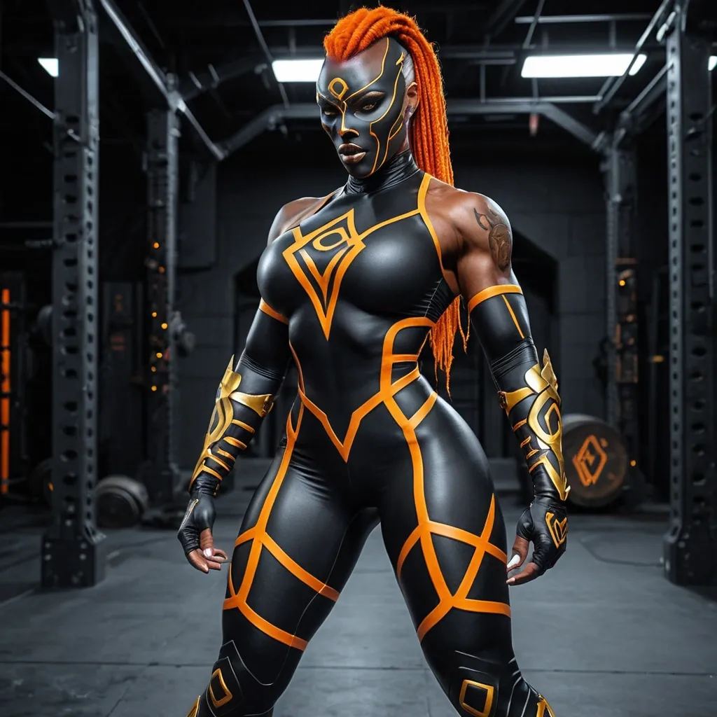 Generate Gorgeous female boss , bimbo , 24 years old , very dark-skinned African-American woman , , gorgeous hazel eyes , hourglass body , abnormally massive female bodybuilder , gorgeous , close up , full lips , big booty , braided mohawk styled mohawk , bald on the side , feminine silhouette , too big breast , big booty , sexy thighs abs , silhouette , up close , flexing biceps , beautiful hazel eyes , legs are iconic and defining physical feature , both visually and in terms of combat ability.wearing an outfit that is a striking blend of elegance , power , and femininity , designed to command attention in any room. The suit is tailored to perfection , hugging the wearer’s curves with precision while emphasizing a structured silhouette. The fabric itself is a refined grey tweed patterned with subtle white grid lines , giving the suit a texture that feels both sophisticated and modern. The blazer features broad blue lapels and gold button accents , adding a luxurious touch that elevates the look beyond typical business attire. The matching high-waisted trousers elongate the frame , further enhancing the poised and commanding effect of the ensemble.The styling choices amplify the boldness of the suit. The inner blouse is a silky , greybutton-down shirt that complements the tweed’s tone while introducing a softer , feminine balance to the sharp tailoring of the jacket. The blouse peeks out neatly from under the blazer , maintaining elegance without drawing focus away from the suit’s commanding cut. Accessories are kept minimal yet intentional: a delicate layered gold necklace and hoop earrings that add glimmers of light and luxury without overpowering the outfit. The choice of voluminous , honey-brown braids cascading down her shoulders frames the face with both confidence and glamour , completing the commanding visual.Altogether , this look communicates a blend of authority and allure. It is business-ready yet fashion-forward , balancing corporate structure with vibrant femininity. The color palette blue , grey and gold avoids being overly delicate , instead embracing the richness of texture , structure , and presence. This is the kind of ensemble that speaks to ambition , sophistication , and personal style—ideal for someone who thrives in positions of influence but insists on expressing her individuality with bold elegance. It’s not just clothing—it’s a statement of power wrapped in grace. In luxury living legs that could crush a watermelon , skirt high boots are a bold and striking statement piece , crafted in glossy black patent leather that gives them a sleek , polished finish. Rising to just below the knee , the boots feature three adjustable buckle straps along the shaft , adding both edge and detail to their design. The towering stiletto heel , paired with a thick platform sole , creates an ultra-dramatic silhouette that elongates the leg and exudes power and confidence. With their combination of shine , height , and structure , these boots perfectly balance fierce femininity with high-fashion allure. High cheekbones , prominent jawline , gorgeous big brown eyes , freckles , The wrestling outfit is a form-fitted , high-compression bodysuit forged from matte obsidian-black tech fabric that clings tightly to a muscular yet feminine frame. Subtle gold and ember-orange circuitry lines trace along the ribs , hips , and spine , glowing faintly like a restrained pulse under motion. The chest bears a raised , armored emblem , embedded into the suit rather than printed , while the high reinforced neckline and sculpted seams emphasize strength , control , and purpose. Bare arms showcase powerful shoulders and thick biceps , paired with reinforced fingerless gloves built for brutal grappling and precision strike , The mask covers the upper half of the face in sleek black hard-leather alloy , edged with fine gold tracing and integrated tech nodes at the temples. Pearl-white glowing eyes stare through the darkness , cold and unblinking , while the mouth and jaw remain exposed—deliberate , threatening , human. Braided black-and-orange hair flows cleanly from the back of the mask , adding motion and menace. Armored leggings reinforce the thighs and knees without sacrificing flexibility , leading into mid-calf boots with gold trim and magnet-grip soles , designed for balance , dominance , and inevitability in the ring. , enormous breast , enormous butt , ,