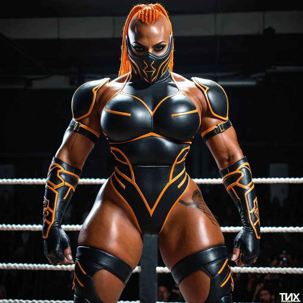 Generate Gorgeous female professional wrestler , bimbo , 24 years old , very dark-skinned African-American woman , , gorgeous hazel eyes , hourglass body , abnormally massive female bodybuilder , gorgeous , close up , full lips , big booty , braided mohawk styled mohawk , bald on the side , feminine silhouette , too big breast , big booty , sexy thighs abs , silhouette , up close , flexing biceps , beautiful hazel eyes , legs are iconic and defining physical feature , both visually and in terms of combat ability.wearing an outfit that is a striking blend of elegance , power , and femininity , designed to command attention in any room. The suit is tailored to perfection , hugging the wearer’s curves with precision while emphasizing a structured silhouette. The fabric itself is a refined grey tweed patterned with subtle white grid lines , giving the suit a texture that feels both sophisticated and modern. The blazer features broad blue lapels and gold button accents , adding a luxurious touch that elevates the look beyond typical business attire. The matching high-waisted trousers elongate the frame , further enhancing the poised and commanding effect of the ensemble.The styling choices amplify the boldness of the suit. The inner blouse is a silky , greybutton-down shirt that complements the tweed’s tone while introducing a softer , feminine balance to the sharp tailoring of the jacket. The blouse peeks out neatly from under the blazer , maintaining elegance without drawing focus away from the suit’s commanding cut. Accessories are kept minimal yet intentional: a delicate layered gold necklace and hoop earrings that add glimmers of light and luxury without overpowering the outfit. The choice of voluminous , honey-brown braids cascading down her shoulders frames the face with both confidence and glamour , completing the commanding visual.Altogether , this look communicates a blend of authority and allure. It is business-ready yet fashion-forward , balancing corporate structure with vibrant femininity. The color palette blue , grey and gold avoids being overly delicate , instead embracing the richness of texture , structure , and presence. This is the kind of ensemble that speaks to ambition , sophistication , and personal style—ideal for someone who thrives in positions of influence but insists on expressing her individuality with bold elegance. It’s not just clothing—it’s a statement of power wrapped in grace. In luxury living legs that could crush a watermelon , skirt high boots are a bold and striking statement piece , crafted in glossy black patent leather that gives them a sleek , polished finish. Rising to just below the knee , the boots feature three adjustable buckle straps along the shaft , adding both edge and detail to their design. The towering stiletto heel , paired with a thick platform sole , creates an ultra-dramatic silhouette that elongates the leg and exudes power and confidence. With their combination of shine , height , and structure , these boots perfectly balance fierce femininity with high-fashion allure. High cheekbones , prominent jawline , gorgeous big hazel eyes , , The wrestling outfit is a form-fitted , professional wrestling gear high-compression bodysuit forged from matte obsidian-black tech fabric that clings tightly to a muscular yet feminine frame. Subtle gold and ember-orange circuitry lines trace along the ribs , hips , and spine , glowing faintly like a restrained pulse under motion. The chest bears a raised , armored emblem , embedded into the suit rather than printed , while the high reinforced neckline and sculpted seams emphasize strength , control , and purpose. Bare arms showcase powerful shoulders and thick biceps , paired with reinforced fingerless gloves built for brutal grappling and precision strike , The mask covers the upper half of the face in sleek black hard-leather alloy , edged with fine gold tracing and integrated paddingnodes at the temples. Pearl-white glowing eyes stare through the darkness , cold and unblinking , while the mouth and jaw remain exposed—deliberate , threatening , human. Braided black-and-orange hair flows cleanly from the back of the mask , adding motion and menace. Armored leggings reinforce the thighs and knees without sacrificing flexibility , leading into mid-calf wrestling boots with gold trimt-grip soles , designed for balance , dominance , and inevitability in the ring. , enormous breast , enormous butt , standing in wrestling ring , enormous butt , enormous butt , thunder thighs , thighs and hips. Powerful stacked hourglass silhouette ,