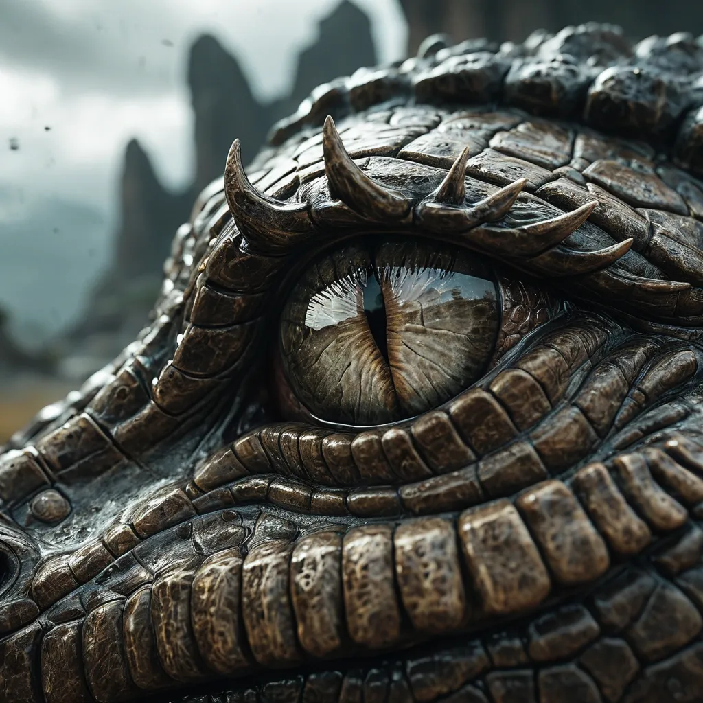 Hyper-realistic extreme macro close-up of an crocodile's eye showing deep textured wrinkled skin , natural skin folds , and ultra-detailed eyelashes with realistic moisture and tear formation. A single tear drop is flowing from the eye , crystal clear and highly reflective. Inside the reflection of the crocodile's eye , show an environmental destruction scene -cracked dry land covered with Dilapidation vibrant Aztec style: God of War , Mysterious Ancient Relics , Epic , grand , octane render , enhance , intricate smoke into a cloudy sky. Use cinematic dramatic lighting , emotional storytelling composition , ultra-realistic textures , shallow depth of field , sharp focus on eye reflection , natural color grading , high contrast , environmental awareness visual campaign style , ultra high resolution , professional wildlife documentary photography aesthetic. ,