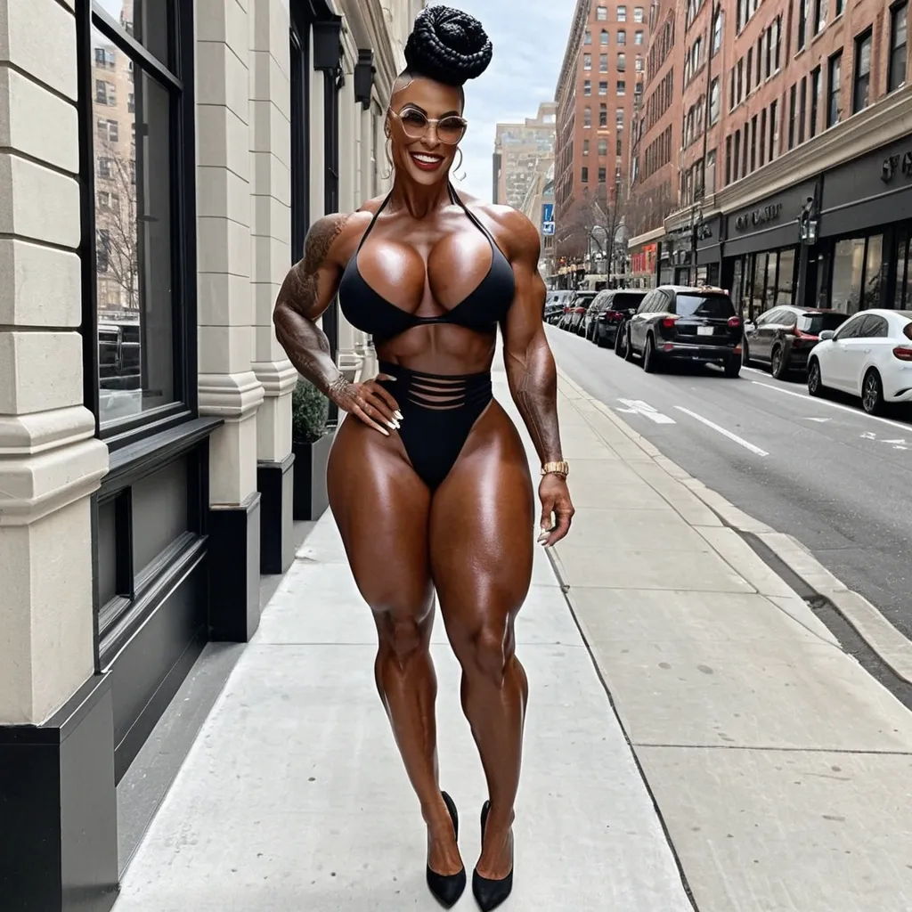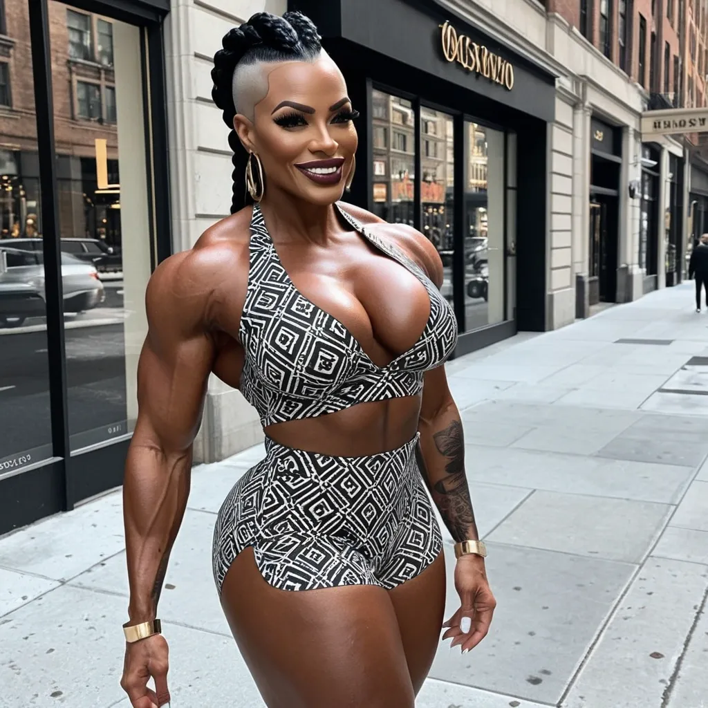 Generate a dark-skinned African-American woman , gorgeous female boss , bimbo , hourglass body , abnormally massive female bodybuilder , gorgeous , close up , full lips , big booty , black hair , braided-style-mohawk that she wears bald on the side , feminine silhouette , too big breast , big booty , sexy thighs abs , silhouette , up close , flexing biceps , beautiful light hazel eyes , legs are iconic and defining physical feature , both visually and in terms of combat ability.wearing an outfit that is a striking blend of elegance , power , and femininity , designed to command attention in any room. outfit in this image is a modern , giving it both structure and a touch of relaxed style. highlighting her curves while keeping the look balanced and versatile. Its neutral tone contrasts nicely against the blue denim , keeping the ensemble cohesive without overpowering the statement of the.Completing the polished and fashionable. Together , the outfit blends everyday comfort with bold , confident styling. This is the kind of ensemble that speaks to ambition , sophistication , and personal style—ideal for someone who thrives in positions of influence but insists on expressing her individuality with bold elegance. It’s not just clothing—it’s a statement of power wrapped in grace , Massive cleavage thunder thighs , enormous butt , muscular legs , hazel eyes , Her outfit gives off classy , soft , feminine elegance with that old-school traditionally ladylike vibe — but modernized just enough to feel fresh. The cream button-up crop top is polished and refined with those gold emblem buttons — that’s a subtle high-value touch without screaming for attention. The sheer/light fabric looks airy and comfortable for daylight wear , and the pearl necklace and earrings lock that timeless feminine grace into place. She looks like she understands that simple well coordinated usually beats loud and chaotic any day.Her tan high-waist trousers balance her top perfectly. They’re modest , smooth , tailored enough to keep things classy , and the matching gold button ties the whole look together so it doesn’t feel like two random pieces. She looks feminine and fashionable without abandoning tradition — like the kind of woman grandma would nod at and say “yes… that’s how a lady dresses for daytime public.” It respects the past while still letting her express her youth and confidence.This is the type of outfit you could wear walking downtown shops , brunch , meeting family , or even a quiet afternoon date. There is softness , poise , refinement , and a little playful confidence in her smile. It’s modest but flattering , and it’s intentional. She looks like she takes pride in presenting herself well — not to impress everyone — but because she values dignity , grace , and showing up in the world looking put together. ,