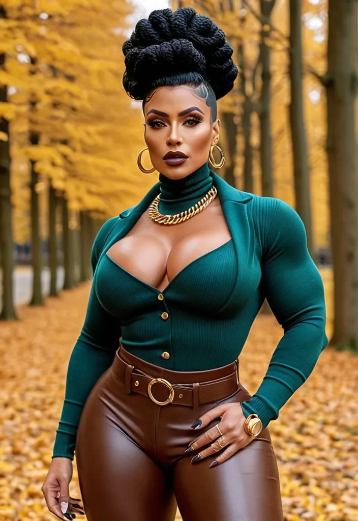 Generate a dark-skinned African-American woman , gorgeous female boss , bimbo , hourglass body , abnormally massive female bodybuilder , gorgeous , close up , full lips , big booty , black hair , braided-style-mohawk that she wears bald on the side , feminine silhouette , too big breast , big booty , sexy thighs abs , silhouette , up close , flexing biceps , beautiful light hazel eyes , legs are iconic and defining physical feature , both visually and in terms of combat ability.wearing an outfit that is a striking blend of elegance , power , and femininity , designed to command attention in any room. outfit in this image is a modern , giving it both structure and a touch of relaxed style. highlighting her curves while keeping the look balanced and versatile. Its neutral tone contrasts nicely against the blue denim , keeping the ensemble cohesive without overpowering the statement of the.Completing the polished and fashionable. Together , the outfit blends everyday comfort with bold , confident styling. This is the kind of ensemble that speaks to ambition , sophistication , and personal style—ideal for someone who thrives in positions of influence but insists on expressing her individuality with bold elegance. It’s not just clothing—it’s a statement of power wrapped in grace , Massive cleavage thunder thighs , enormous butt , muscular legs , hazel eyes , The outfit blends cozy autumn fashion with effortless street-style polish. She wears a deep green turtleneck sweater that fits snugly , highlighting her neck and shoulders with a refined elegance. The rich forest tone feels warm and seasonal , perfectly contrasting her glowing skin and gold accessories. Layered over the sweater is a dark denim jacket with bronze buttons , adding casual structure and giving the look dimension. The combination of textures—soft knit and sturdy denim—creates a balanced and stylish ensemble. Her accessories elevate the outfit from simple to captivating. Large gold hoop earrings with dangling turquoise charms draw attention to her face and add a playful yet glamorous touch. Around her neck , she wears a delicate gold necklace with a small pendant that ties in beautifully with the earrings and the golden undertones in her makeup. Even her belt—classic brown leather with a metal buckle—adds a subtle vintage aesthetic that enhances the fall vibe. The accessories feel intentional , bringing sophistication without overpowering the casual layers. To complete the look , she carries a mustard-yellow tote bag slung over her shoulder , adding a bright pop of color that complements the autumn backdrop. The warm tone meshes seamlessly with the earthy palette of the outfit and gives her a confident , academic aesthetic—especially as she holds what appears to be a book or notebook. Combined with her voluminous curly hair and bold golden eye makeup , the outfit tells a story: she’s stylish , intelligent , and effortlessly captivating , blending comfort and confidence in a way that feels both modern and timeless. ,