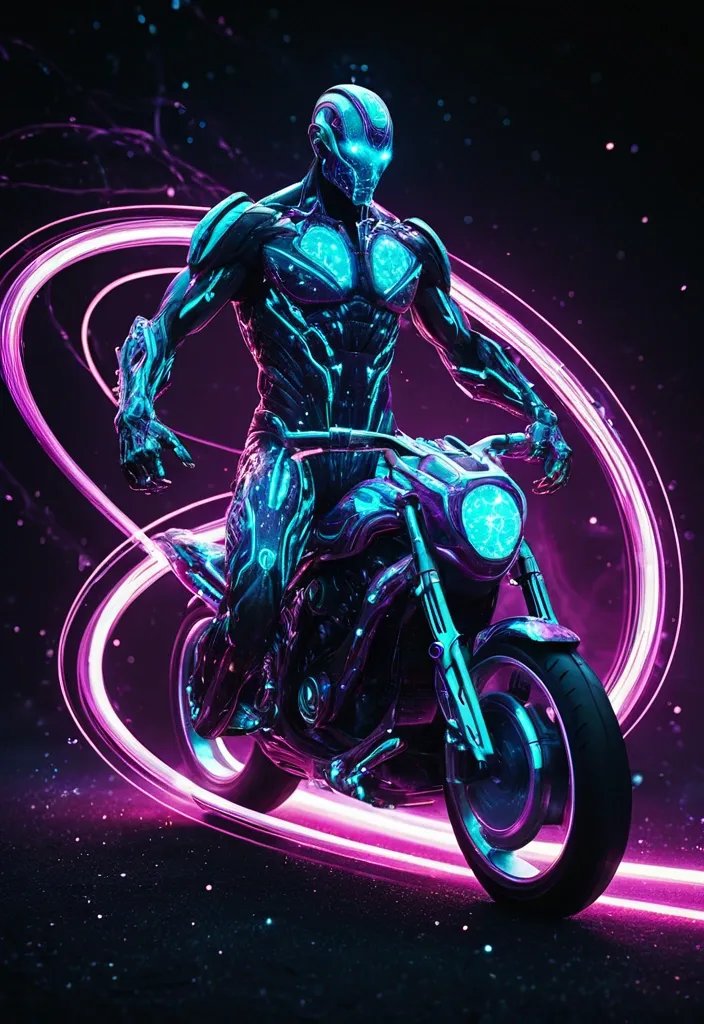 A Kinetic Light image of a cybernetic , cybernetic muscular male Na'vi rider , An atmospheric engine , the principle of which is fueled by the planet's atmosphere , is made with Electronic circuit pattern and wires , bone and metal grim dark for a bike , formed by swirling light trails in vibrant hues of magenta and teal. Style: Celestial , ethereal , abstract , digital art smoking: Dramatic backlighting , bright glowing particles , contrasting dark background Composition: dynamic diagonal composition , upward gaze Details: Sparkling rings edge , streaking white light trails , sense of movement and wonder , magical atmosphere Quality: High detail , 4K , Masterpiece , Rendered in Octane ,