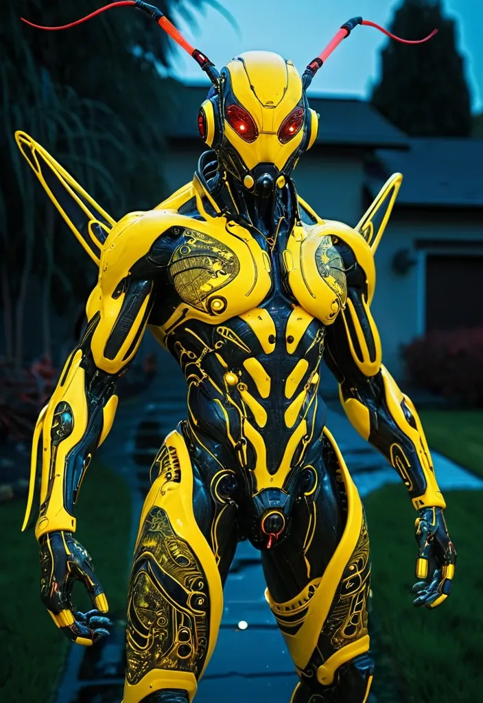 Fish eye long-distance view , Electronic circuit pattern and wires , cybernetic muscular male Na'vi rider on , a futuristic concept Bee , dripping oil the entire body and red glow , main body is finished in smooth deep yellow with sharp black filigree patterns that trace along the edges of moving wings with motion , at landscape of backyard. ,