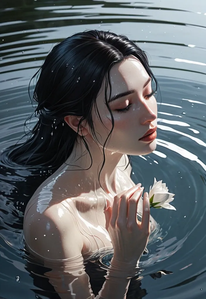 We want an in-depth picture of an anime cartoon girl , specifically designed with a dreamlike , ethereal aesthetic that emphasizes her innocence and connection to nature. The perspective should be a high-angle , looking down at her from above (POV) , giving the viewer a sense of gentle observation , almost like a bird's eye view , but still close enough to discern fine details of her expression and surroundings. The overall mood should be tranquil and slightly melancholic , rendered with soft , diffused lighting. The girl is positioned in shallow , crystal-clear water , barely covering her ankles , suggesting a serene pool or a calm , pristine stream. The water should be so transparent that the smooth , round pebbles and fine sand at the bottom are clearly visible beneath the surface. Small ripples should gently emanate outwards from her feet , indicating her subtle presence , but without disrupting the overall stillness. The water's surface should reflect the soft , ambient light , creating a delicate , shimmering effect. Her left hand is held open , palm facing upwards , directly towards the viewer. Within the very center of her palm , nestled delicately , is a single , small , pristine white flower , perhaps a lily-of-the-valley or a simple wildflower. The flower should appear almost luminescent , a tiny beacon of purity against her skin. A few delicate drops of water are captured in suspended motion , just beginning to fall from her outstretched hand , creating tiny , sparkling arcs of liquid light that enhance the magical realism of the scene. Her clothing is wet and clings softly to her form , subtly revealing the outline of her body beneath without being overtly explicit. The fabric should appear slightly transparent where it's most saturated with water , particularly around her shoulders and chest. The texture of the wet fabric should be finely detailed , showing the gentle folds and adherence to her skin , emphasizing the natural immersion in her environment. The color of her garment should be a soft , muted white or pale cream , enhancing her ethereal quality. Her long , straight black hair is a defining feature , cascading down her back and shoulders , partially submerged in the shallow water around her. The hair should be rendered with a luxurious , almost liquid sheen , reflecting the ambient light and appearing incredibly soft and lustrous. Individual strands should be discernible , especially where it is wet , clinging together in graceful , flowing sections. The contrast of her dark hair against her pale skin and the light water will be visually striking. The girl's face is exceptionally beautiful and innocent , with large , expressive eyes that are looking directly upwards , engaging with the viewer's high-angle perspective. Her gaze should be wide and slightly wistful , conveying a sense of wonder and perhaps a touch of vulnerability. Her lips are full and subtly colored , perhaps a natural rose or pale peach , parted ever so slightly as if in a soft sigh. Her skin is flawless and luminous , shaded with gentle , soft tones that suggest natural light. The art style should be a high-quality , contemporary anime illustration , prioritizing soft lines and exquisite detail over bold outlines. The rendering should be smooth and painterly , akin to digital watercolor or soft cel-shading , with careful attention to gradients and diffused light sources. The character design should evoke classic shōjo aesthetics but with a grounded , realistic sense of proportion and gentle emotion. The composition should feel balanced and serene. Her body should be slightly curved , or her head tilted , to naturally accommodate the overhead perspective. The water , the flower , and her expression should draw the eye towards her face and the delicate gesture of her hand , making them the undeniable focal points of the illustration. The empty space around her in the shallow water should contribute to the feeling of peace and isolation. The background , beyond the immediate water , should repainted anime. ,