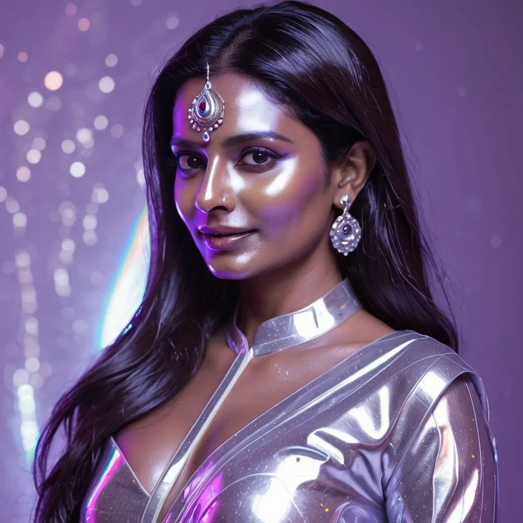 A detailed fantastic futuristic image of a south Indian mature woman with a beautiful appearance and glossy skin teleports in a stream of highly vibrational energy. Face/skin: glossy porcelain , mirrored highlights on cheeks , nose and forehead , soft smile. Eyes: lilac , glossy sheen in the eyes. Hair: fashionable dark brown and long hair , with shiny tips , shiny. Lips: with an ultra-moist sheen. futuristic traditional saree made of lemon matte material with an asymmetrical cut and cutouts , with glitter. Background: white , with an iridescent sheen . Lighting: professional bright , rainbow highlights. 85 mm. Textures: shiny vinyl skin with pore texture , shiny hair. ,
