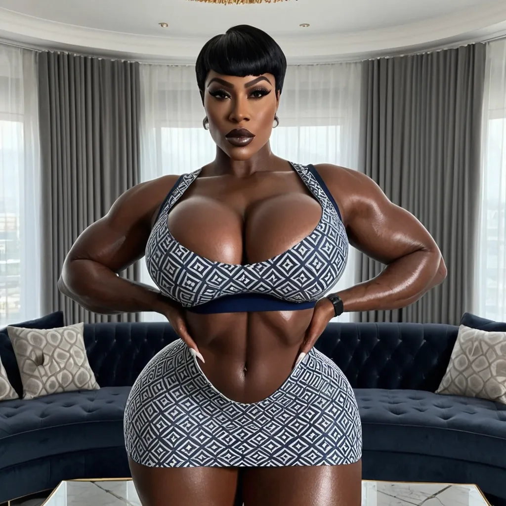 Generate Gorgeous female boss , bimbo , very dark-skinned African-American woman , short , pixie hair , hourglass body , abnormally massive female bodybuilder , gorgeous , close up , full lips , big booty , dark brown eyes , very big plump lips , feminine silhouette , too big breast , big booty , sexy thighs abs , silhouette , up close , flexing biceps , big gorgeous light brown eyes , legs are iconic and defining physical feature , both visually and in terms of combat ability.wearing an outfit that is a striking blend of elegance , power , and femininity , designed to command attention in any room. The suit is tailored to perfection , hugging the wearer’s curves with precision while emphasizing a structured silhouette. The fabric itself is a refined grey tweed patterned with subtle white grid lines , giving the suit a texture that feels both sophisticated and modern. The blazer features broad blue lapels and gold button accents , adding a luxurious touch that elevates the look beyond typical business attire. The matching high-waisted trousers elongate the frame , further enhancing the poised and commanding effect of the ensemble.The styling choices amplify the boldness of the suit. The inner blouse is a silky , greybutton-down shirt that complements the tweed’s tone while introducing a softer , feminine balance to the sharp tailoring of the jacket. The blouse peeks out neatly from under the blazer , maintaining elegance without drawing focus away from the suit’s commanding cut. Accessories are kept minimal yet intentional: a delicate layered gold necklace and hoop earrings that add glimmers of light and luxury without overpowering the outfit. The choice of voluminous , honey-brown braids cascading down her shoulders frames the face with both confidence and glamour , completing the commanding visual.Altogether , this look communicates a blend of authority and allure. It is business-ready yet fashion-forward , balancing corporate structure with vibrant femininity. The color palette blue , grey and gold avoids being overly delicate , instead embracing the richness of texture , structure , and presence. This is the kind of ensemble that speaks to ambition , sophistication , and personal style—ideal for someone who thrives in positions of influence but insists on expressing her individuality with bold elegance. It’s not just clothing—it’s a statement of power wrapped in grace. In luxury living legs that could crush a watermelon , skirt high boots are a bold and striking statement piece , crafted in glossy black patent leather that gives them a sleek , polished finish. Rising to just below the knee , the boots feature three adjustable buckle straps along the shaft , adding both edge and detail to their design. The towering stiletto heel , paired with a thick platform sole , creates an ultra-dramatic silhouette that elongates the leg and exudes power and confidence. With their combination of shine , height , and structure , these boots perfectly balance fierce femininity with high-fashion allure. Massive breast , massive cleavage , driving and standing in living room , short fingernails wearing a white , dark navy blue and black accented subtle symmetrical patterned t-shirt , massive cleavage , grey skirt , enormous butt , arms folded ,