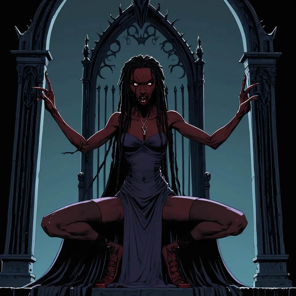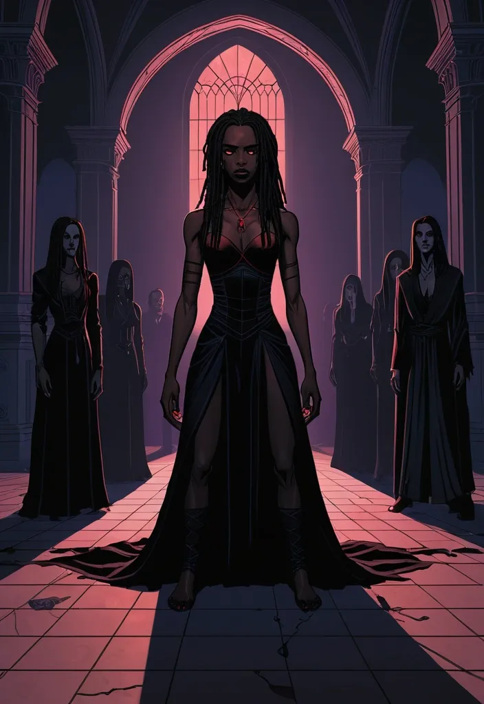A slender , graceful vampire , appearing in her late 20s to early 30s with dark skin , long dark dreadlocks , and striking eyes with a subtle reddish hue , stands alone , surrounded by other vampires , facing threats due to her forbidden romance. The scene is rendered in a graphic novel style , with bold lines and dramatic shadows , reminiscent of Artstation illustrations. The atmosphere is dark and menacing , with deep shadows obscuring the faces of the surrounding vampires. Their expressions are cold and hostile. The overall color palette is muted , with dark blues , purples , and blacks dominating , creating a sense of danger and isolation. ,