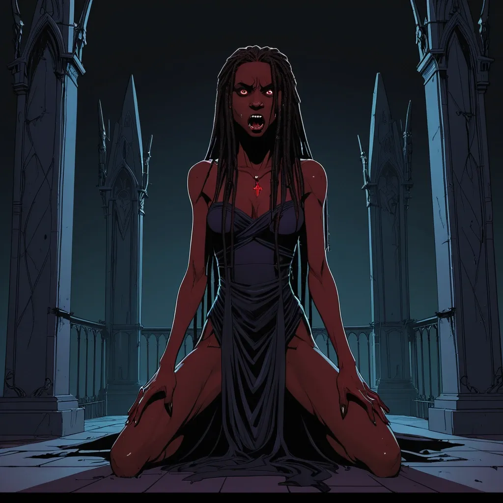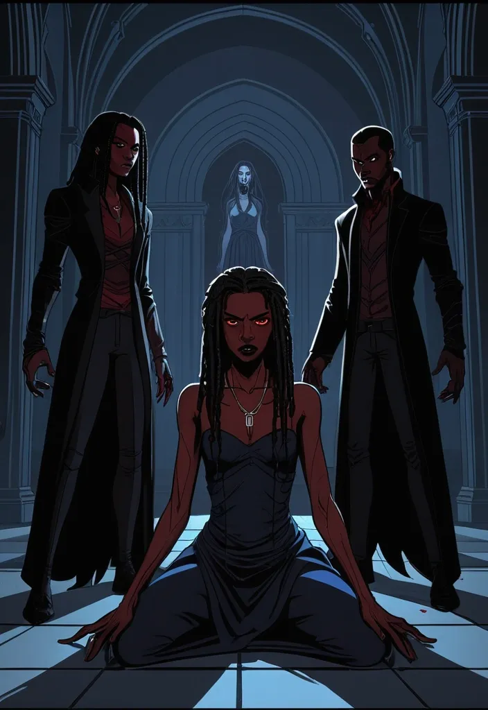 In a grand hall , a slender , graceful vampire , appearing in her late 20s to early 30s with dark skin , long dark dreadlocks , and striking eyes with a subtle reddish hue , kneels in the center , being judged by other vampires. This illustration is rendered in a graphic novel style , with bold lines and dramatic shadows , reminiscent of Artstation illustrations. The surrounding vampires accuse her , their faces filled with contempt. The lighting is dramatic , casting long shadows and highlighting the tension in the scene. The overall color palette is dark and oppressive , with muted blues , purples , and blacks dominating , emphasizing her vulnerability and the severity of the situation. ,