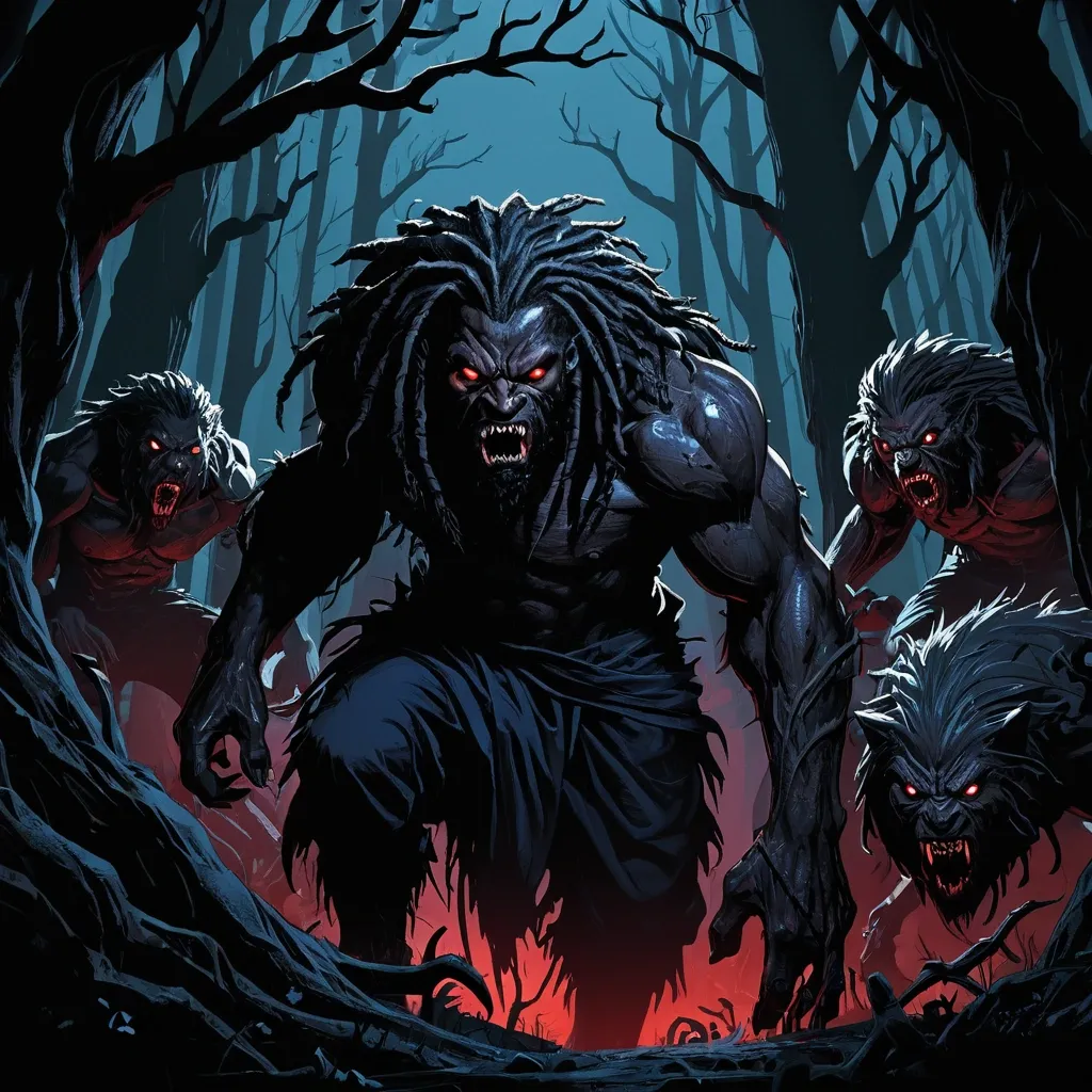 A strong , imposing werewolf with dark skin , dreadlocks , and wolf-like eyes is hunted through a dark forest by a group of vampires. This illustration is rendered in a graphic novel style , with bold lines and dramatic shadows , reminiscent of Artstation illustrations. The vampires are relentless in their pursuit , their eyes glowing red in the darkness. The trees are gnarled and twisted , adding to the sense of danger and unease. The overall color palette is dark and oppressive , with muted blues , purples , and blacks dominating , emphasizing the werewolf's vulnerability and the vampires' predatory nature. ,