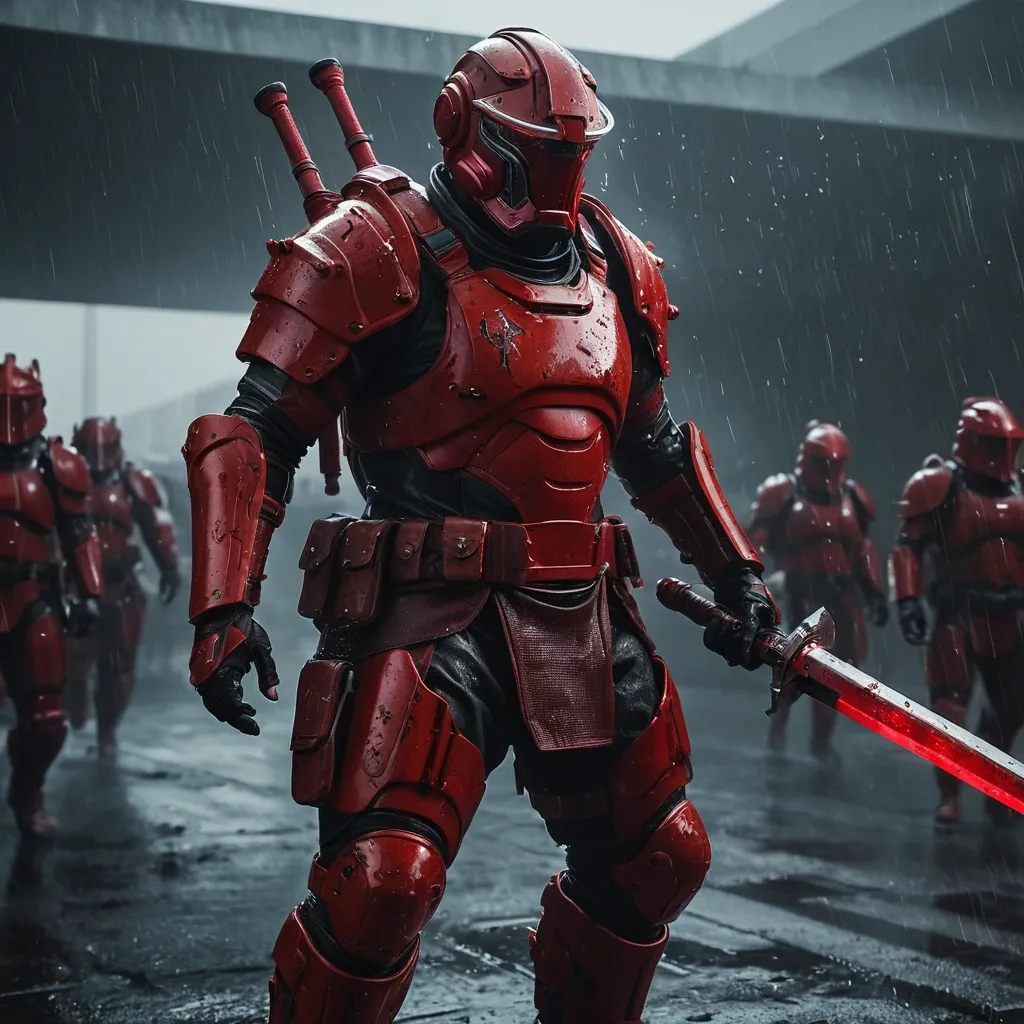 A gritty photograph showcasing a Futuristic soldier in white and red armor with dual weapons , featuring a sleek design and a reflective red visor atop a massive , roaring Hippopotamus. The soldier , clad in worn leather and red armor , grips a sword , his face contorted in a grimace of effort and fury , with streaks of rain mixing with dirt across his cheek. Harsh , chiaroscuro lighting from a sudden flash of lightning illuminates the scene , casting stark shadows and highlighting the glint of wet metal amidst billowing smoke in the distant background. Shot in realistic live-action cinematography style. High dynamic range lighting , cinematic color grading , subtle film grain. Natural optical depth of field , realistic lens blur , slight handheld camera micro-movement. 50mm cinematic lens , f/4 aperture , physically accurate lighting , volumetric light diffusion. 8K level visual fidelity , highly detailed environment , believable scale and realistic crowd simulation. The scene feels like a frame from a large-budget live-action science-fiction space movie. ,