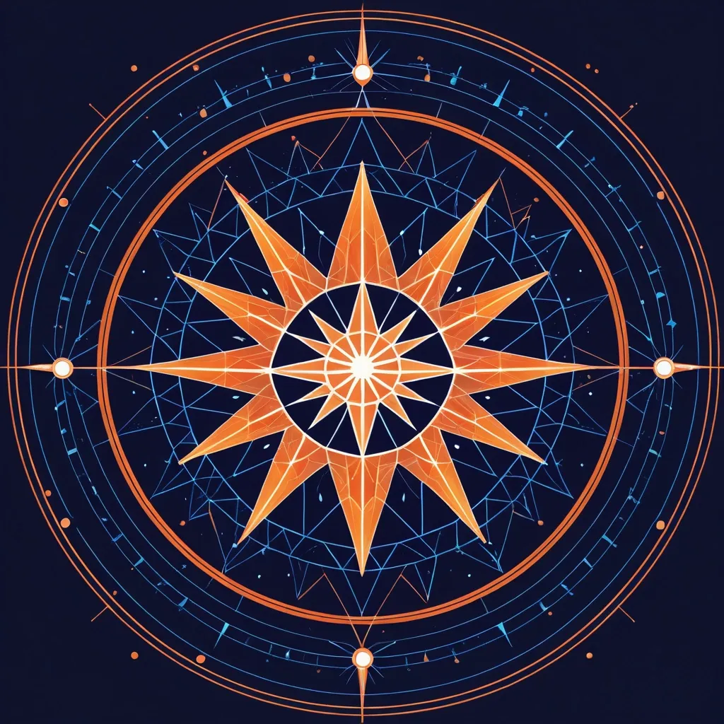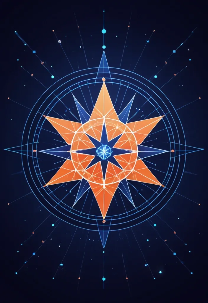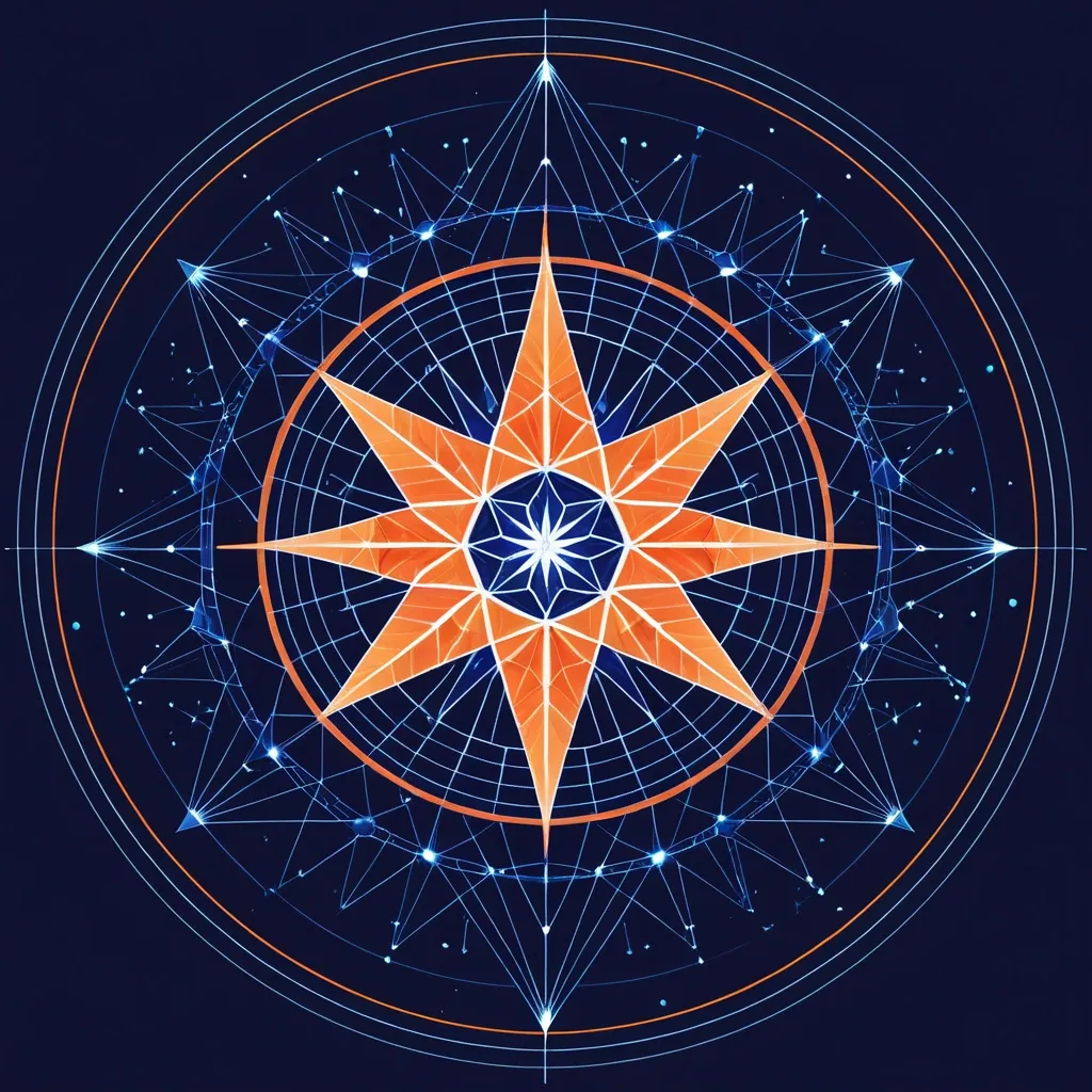 A minimalist geometric logo featuring a crystalline compass rose with 40 facets representing the ethical vectors. At the center , a pulsing orange heart (🟧) made of transparent crystal , emitting soft light rays. The compass points are stylized as neural pathways merging with sacred geometry patterns. Clean , modern design in deep indigo blue and luminous orange , with subtle quantum dot patterns in the background. The overall aesthetic should balance scientific precision with spiritual elegance - think bio-digital mandala meeting ethical navigation system. Style: vector logo , high contrast ,