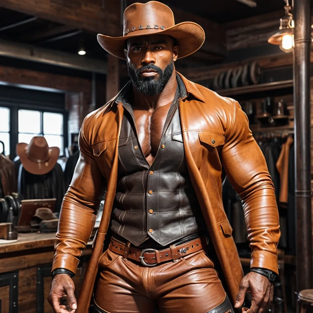 Generate ruggedly handsome man dark-skinned African-American cowboy abnormally massive male bodybuilder , well-trimmed beard , , close up , full lips , big booty , black trimmed coarse hair , big , muscular man , brown strikingly intense and alluring eyes , up close , flexing biceps , big gorgeous brown eyes , legs are iconic and defining physical feature , both visually and in terms of combat ability.wearing an outfit that is a striking blend of elegance , power , and femininity , designed to command attention in any room. The suit is tailored to perfection , hugging the wearer’s curves with precision while emphasizing a structured silhouette. The fabric itself is a refined grey tweed patterned with subtle white grid lines , giving the suit a texture that feels both sophisticated and modern. The blazer features broad blue lapels and gold button accents , adding a luxurious touch that elevates the look beyond typical business attire. The matching high-waisted trousers elongate the frame , further enhancing the poised and commanding effect of the ensemble.The styling choices amplify the boldness of the suit. The inner shirt is a silky , greybutton-down shirt that complements the tweed’s tone while introducing a masculine balance to the sharp tailoring of the jacket. The shirt peeks out neatly from under the blazer , maintaining elegance without drawing focus away from the suit’s commanding cut. Accessories are kept minimal yet intentional: a delicate layered gold necklace ad alpha leader of light and luxury without overpowering the outfit completing the commanding visual.Altogether , this look communicates a blend of authority and allure. It is business-ready yet fashion-forward , balancing corporate structure with vibrant femininity. The color palette blue , grey and gold avoids being overly delicate , instead embracing the richness of texture , structure , and presence. This is the kind of ensemble that speaks to ambition , sophistication , and personal style—ideal for someone who thrives in positions of influence but insists on expressing her individuality with bold elegance. It’s not just clothing—it’s a statement of power wrapped in grace. In luxury living legs that could crush a watermelon , skirt high boots are a bold and striking statement piece , crafted in glossy black patent leather that gives them a sleek , polished finish. Rising to just below the knee , the boots feature three adjustable buckle straps along the shaft , adding both edge and detail to their design. The towering stiletto heel , paired with a thick platform sole , creates an ultra-dramatic silhouette that elongates the leg and exudes power and confidence. With their combination of shine , height , and structure , these boots perfectly balance fierce femininity with high-fashion allure , burnt orange , white beige plaid button up shirt , brown leather pants , and vest , leather jacket , Stetson hat , gray cargo pants. Wearing a cowboy hat , brown leather trench-coat , six-shooter holstered on Leather gun belt. Standing in saloon. Plaid button up t-shirt ,