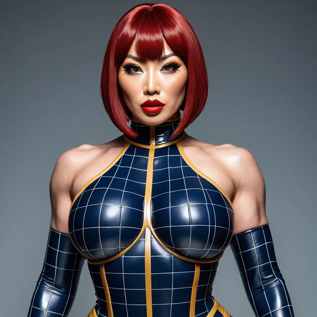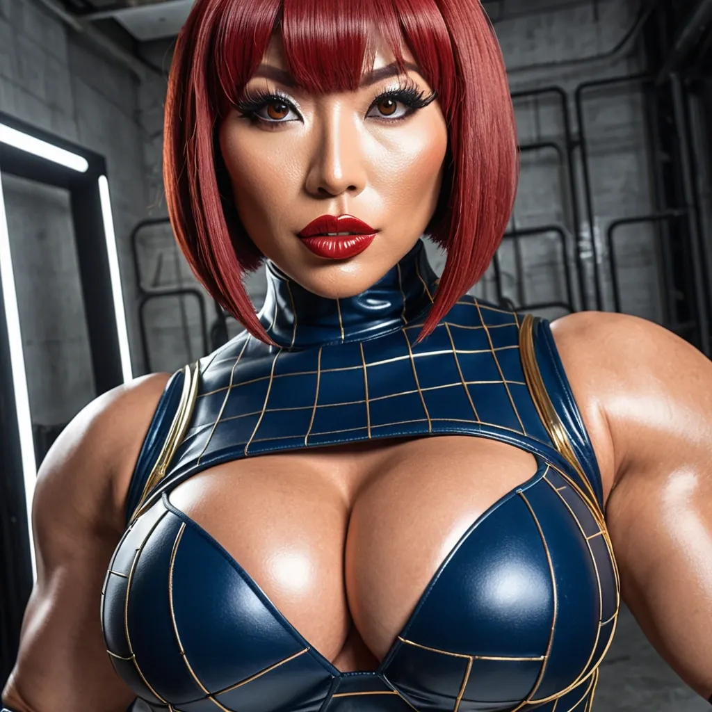 Generate Gorgeous female superhero , 34 years old , Japanese woman , pointy face , bimbo , hourglass body , abnormally massive female bodybuilder , gorgeous , close up , full lips , big booty , red hair breast , short bob-cut , bangs cover forhead design hair , feminine silhouette , too big breast , big booty , sexy thighs abs , silhouette , up close , flexing biceps , beautiful green eyes , legs are iconic and defining physical feature , both visually and in terms of combat ability.wearing an outfit that is a striking blend of elegance , power , and femininity , designed to command attention in any room. The suit is tailored to perfection , hugging the wearer’s curves with precision while emphasizing a structured silhouette. The fabric itself is a refined grey tweed patterned with subtle white grid lines , giving the suit a texture that feels both sophisticated and modern. The blazer features broad blue lapels and gold button accents , adding a luxurious touch that elevates the look beyond typical business attire. The matching high-waisted trousers elongate the frame , further enhancing the poised and commanding effect of the ensemble.The styling choices amplify the boldness of the suit. The inner blouse is a silky , greybutton-down shirt that complements the tweed’s tone while introducing a softer , feminine balance to the sharp tailoring of the jacket. The blouse peeks out neatly from under the blazer , maintaining elegance without drawing focus away from the suit’s commanding cut. Accessories are kept minimal yet intentional: a delicate layered gold necklace and hoop earrings that add glimmers of light and luxury without overpowering the outfit. The choice oframes the face with both confidence and glamour , completing the commanding visual.Altogether , this look communicates a blend of authority and allure. It is business-ready yet fashion-forward , balancing corporate structure with vibrant femininity. The color palette blue , grey and gold avoids being overly delicate , instead embracing the richness of texture , structure , and presence. This is the kind of ensemble that speaks to ambition , sophistication , and personal style—ideal for someone who thrives in positions of influence but insists on expressing her individuality with bold elegance. It’s not just clothing—it’s a statement of power wrapped in grace. In luxury living legs that could crush a watermelon , skirt high boots are a bold and striking statement piece , crafted in glossy black patent leather that gives them a sleek , polished finish. Rising to just below the knee , the boots feature three adjustable buckle straps along the shaft , adding both edge and detail to their design. The towering stiletto heel , paired with a thick platform sole , creates an ultra-dramatic silhouette that elongates the leg and exudes power and confidence. With their combination of shine , height , and structure , these boots perfectly balance fierce femininity with high-fashion allure. Gorgeous brown eyes , big lips glossy lips , enormous breast , enormous butt , up close face portrait , massive cleavage , dark navy blue , gray and gold accented , grid patterned leather bodysuit , matching half mask covering top half of body ,
