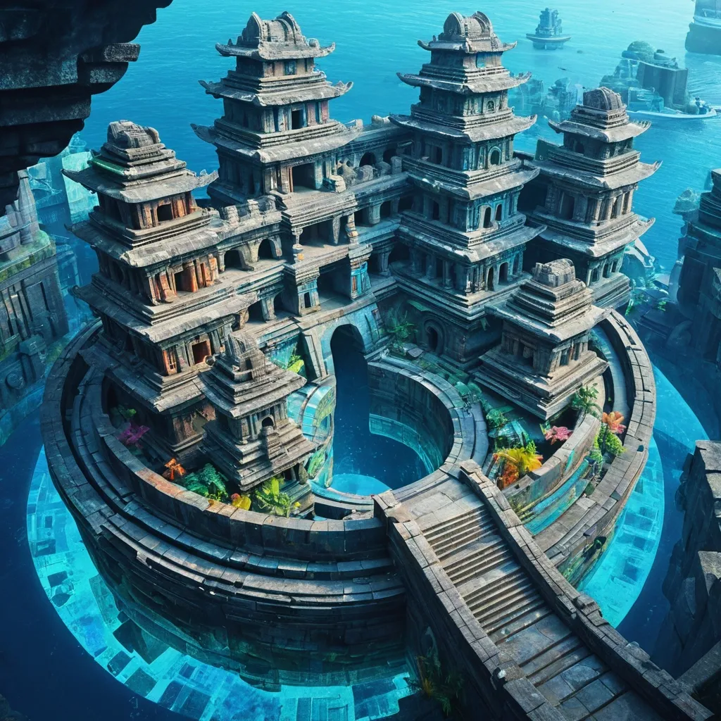 A cylinder-shaped Indonesian Fort architecture , (Colorful temple ruins in clear blue light) masterpieces. A chaotic urban block with twisted geometric forms - buildings bending into impossible angles , roads looping and bridges connecting temple structures that in underwater of ocean. A winding stone staircase leads from the underwater to an open doorway , inviting viewers into the house , Realistic photography , Very detailed and clear panoramic view of the temple during a voyage , realistic , best quality. ,