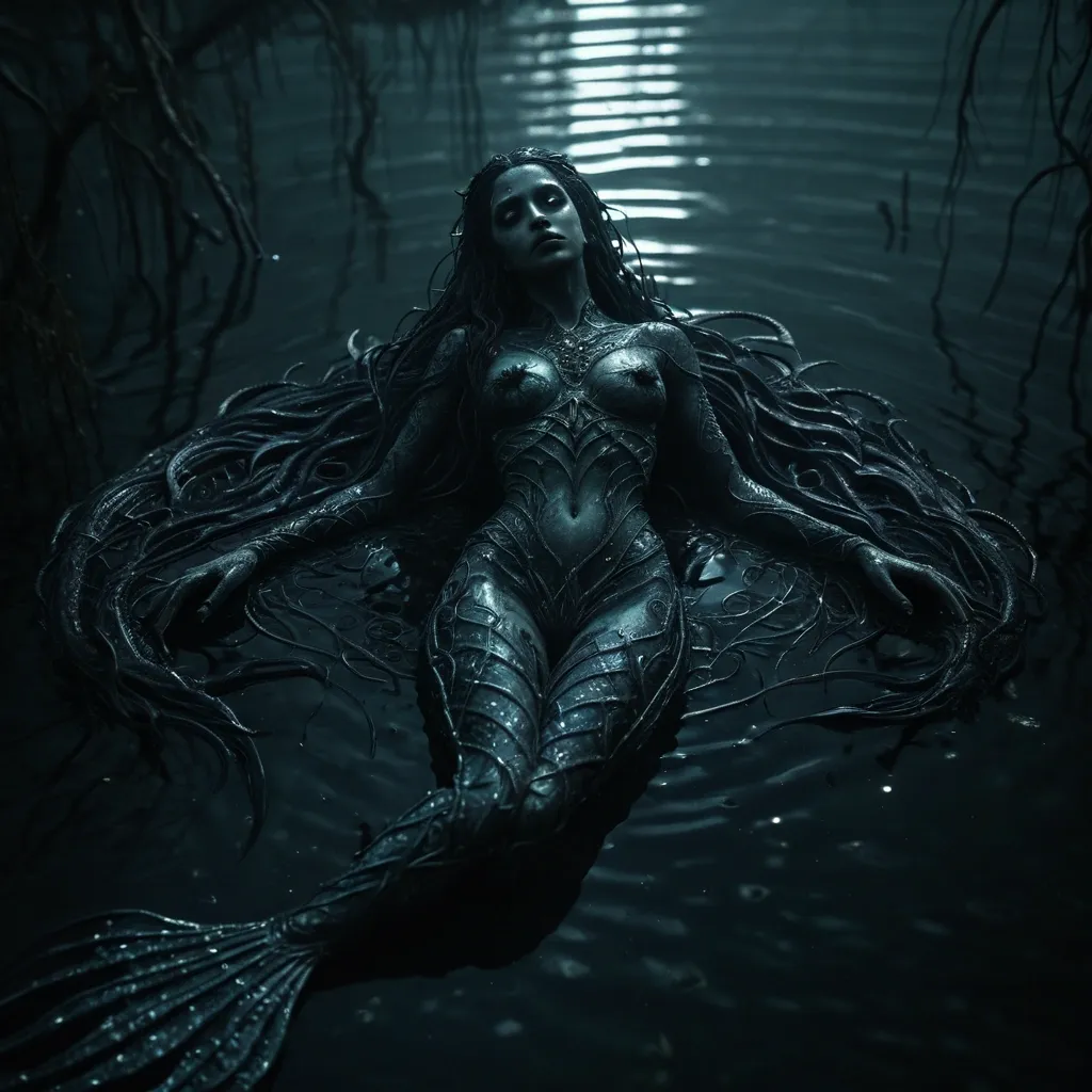 A beautiful , unholy siren mermaid with intricate , dark , and detailed design , resting on a wet , dense , mysterious lake. The creepy , horror-themed creature emanates an aura of dread. Dramatic lighting , reminiscent of a cinematic , photorealistic 8k film still , casts eerie shadows across the water's surface , enhancing the scene's unsettling atmosphere. ,