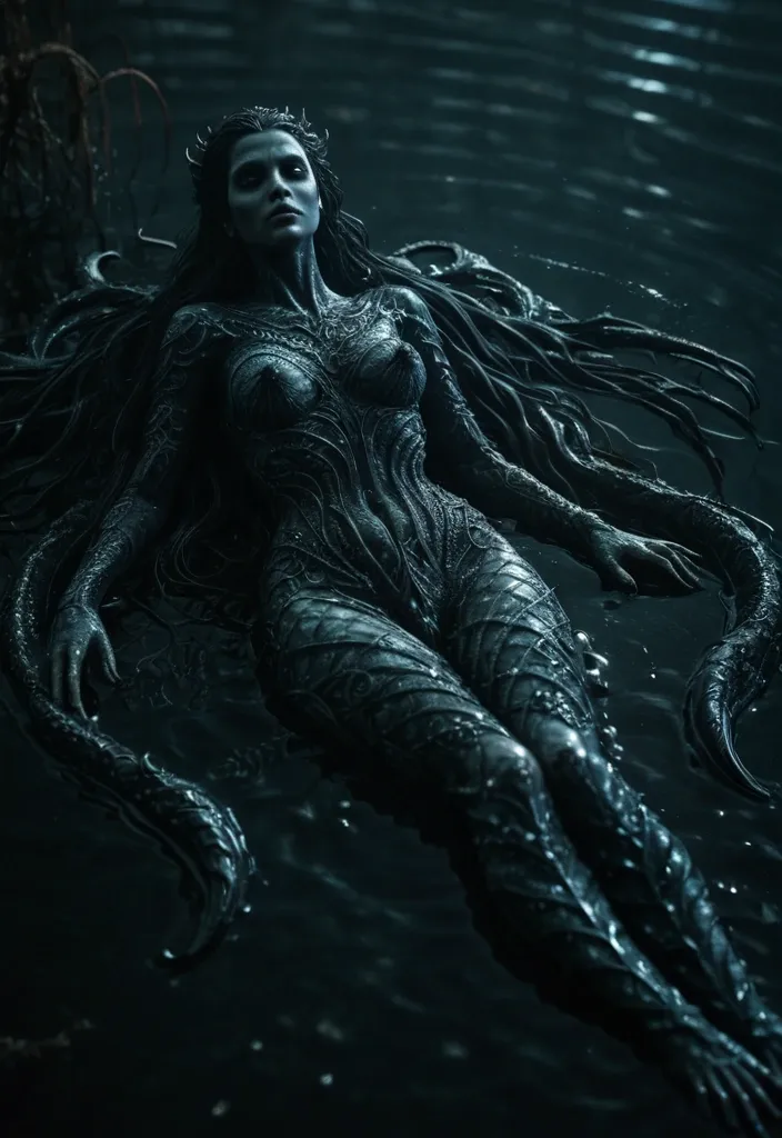 A beautiful , unholy siren mermaid with intricate , dark , and detailed design , resting on a wet , dense , mysterious lake. The creepy , horror-themed creature emanates an aura of dread. Dramatic lighting , reminiscent of a cinematic , photorealistic 8k film still , casts eerie shadows across the water's surface , enhancing the scene's unsettling atmosphere. ar-9:16 ,