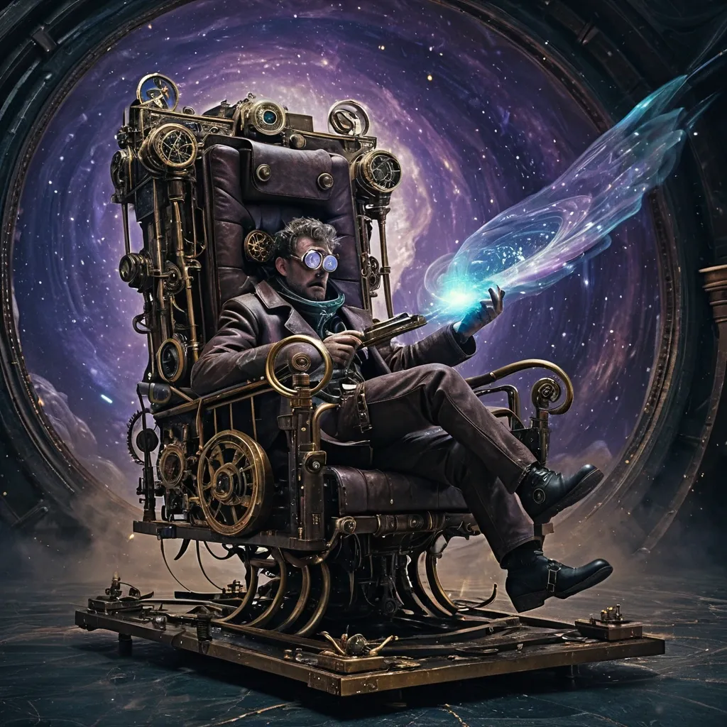 A **time traveler** in a **steampunk-inspired mechanical armchair** , hurtling through a **swirling void of time and space** , where fragmented objects from different eras—ancient scrolls , medieval swords , Victorian pocket watches , futuristic holograms , and retro sci-fi gadgets—float chaotically around them. The traveler , clad in a **weathered leather coat with brass buckles and goggles** , grips the armrests tightly , their expression a mix of **determination and awe** as temporal distortions ripple through the void. The mechanical chair is **intricate and industrial** , with exposed gears , glowing energy cores , and rusted metal plating , suggesting both **advanced technology and the passage of time**. The scene is rendered in a **highly detailed , cinematic style** , blending **dark , moody lighting** with **vibrant bursts of temporal energy**—swirling blues , purples , and golds—illuminating the floating artifacts. The background is a **cosmic abyss** with faint constellations and warped timelines visible in the distance , creating a sense of **both vastness and urgency**. The composition emphasizes **motion and dynamism** , with debris trailing behind the chair as if caught in a **time warp** , while the traveler’s posture suggests **forward momentum into the unknown**. Inspired by **sci-fi concept art and dark fantasy illustrations** , the image balances **mechanical precision** with **ethereal surrealism** , evoking a feeling of **adventure , mystery , and the relentless march of time**. ,