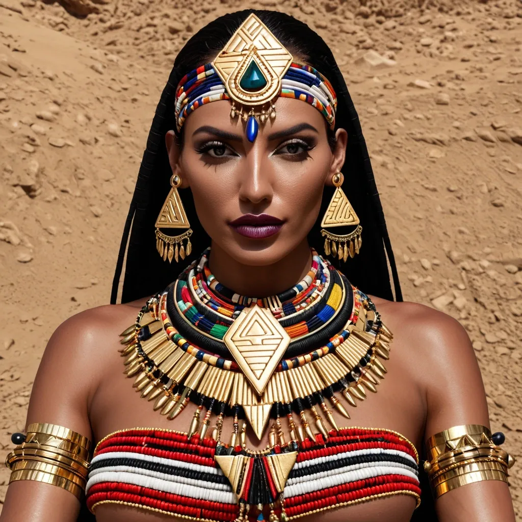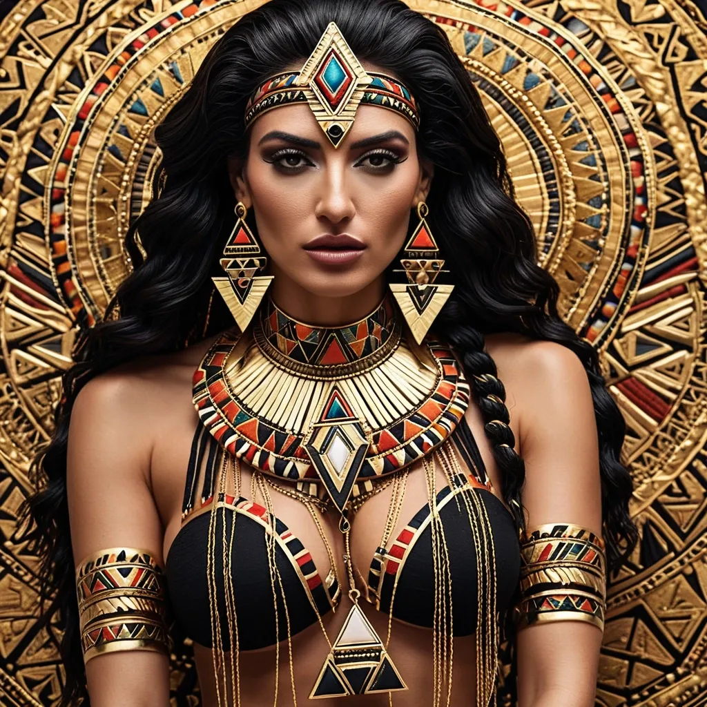 A Aztec style , Craft multi-layered Luxury Jewelry using strips of Maasai fabric , Use Egyptians fabric as the central element that ties different components of the jewelry together , such as beads , gold , and fabrics from Egyptians cultures for a global fusion. consisting of small rings with silver triangular pieces attached to it and containing a piece decorated with Egyptians motifs , show on female neck , fantasy , symbolism , gold leaf , patterned , figurative ,