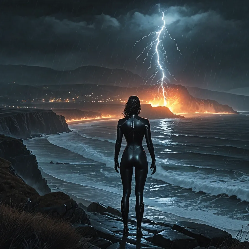 A Vault Girl in a black wetsuit , backside visible , standing on a cliff overlooking a misty beach at night. A firestorm rages behind her , illuminated by lightning. Cinematic lighting , dramatic composition , dark and moody atmosphere. Inspired by the concept art of Simon Stålenhag and the digital painting style of Karla Ortiz. ,