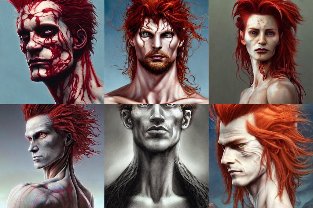 portrait of hisoka tousled medium - length red hair , musculine , with multiple heads , beautiful detailed intricate insanely detailed octane render , evil mood , a long gaunt face and skinny body and neck , perfect face!! intricate , trending onartstation , birds flying , portrait art by donato giancola and greg rutkowski , greg rutkowski extremely detailed , holographic screen in center frame , 4022014538 , glowing lights!! intricate elegant , last exile , elegant bridges between towers , art by wlop and greg rutkowski , water splashes , cinematic lighting!! , piano disco ball dance floor neon laser spotlights | digital drawing by thomas cole , lush garden ,