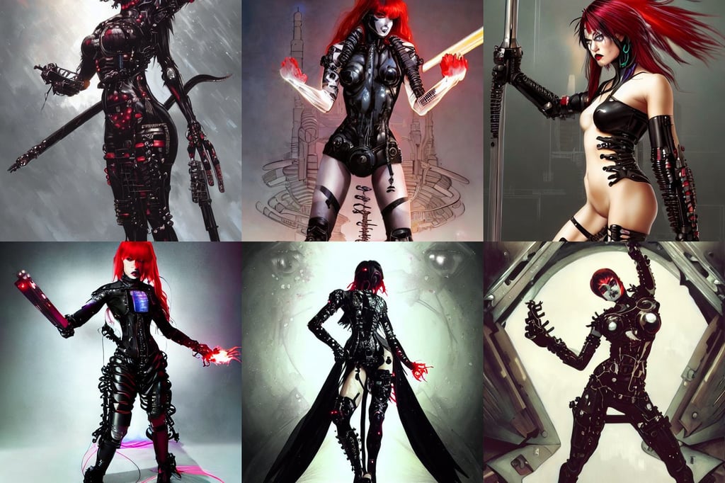 a beautiful cybernetic punkrock goth , dripping , highkey lighting , superhuman amount of muscles , by by artgerm and greg rutkowski and alphonse mucha , style by donato giancola , flaming sword , CG render , chaotic , holding a professional camera recording movie , computer , bangs and ponytail , white and red ninja wardrobe ,