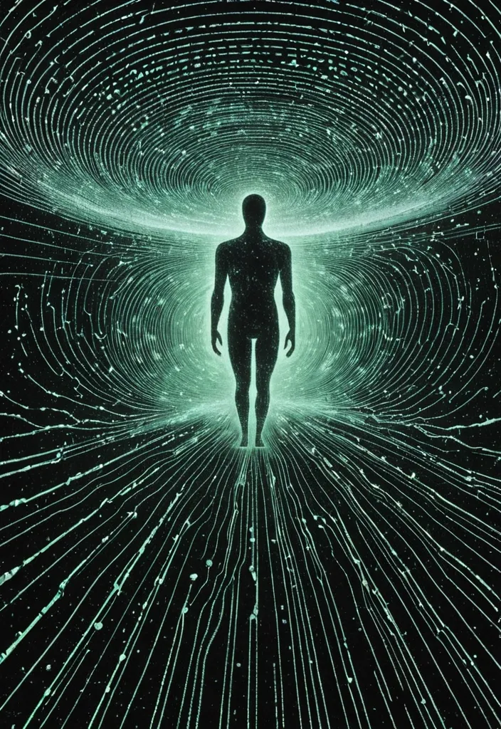 A high-angle bird's-eye view , a landscape Tornado Melting from a vortex moonlight rendered as a Fractal ray , abstract graphic Interference style , A lone woman stands on , gazing at a moonlight that paints the sky in hues of blue , gray and black , shrouded in light-blue and white tulle-like dots , set against a low-resolution dark night background with subtle white accents. The minimalist , naturalistic landscape features a dynamic diagonal composition with dramatic backlighting , bright glowing particles , and streaking white light trails , evoking a sense of movement , wonder , and magical atmosphere , rendered in high-detail 4K with Octane. ,