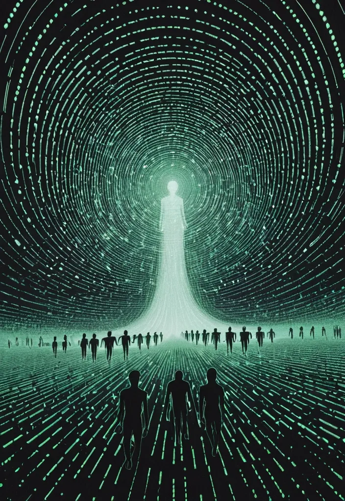 Minimalism Pointillism Graphic electronic drawing , From a swirl of black powder electronic dots emerges a transparent , a dense procession of human-shaped figures fills the frame from foreground to deep distance , arranged in parallel lines that narrow toward the horizon. The figures are elongated and simplified , without facial features , their bodies textured like weathered stone or layered paint. Each form carries a distinct wash of color , ranging from cool blues and greens on the left to warmer yellows , oranges , and deep reds on the right , creating a gradual spectrum across the crowd , vortex motion made of red smoke , on a black background , inversion of gray dots , maturation , fractal , fluorescent green eyes , carving through streaking red light smokes. Style: Celestial , ethereal , digital art smoking: Dramatic backlighting , bright glowing particles , contrasting dark background Composition: dynamic diagonal composition , upward gaze Details: Sparkling pink waves and smoke , streaking white light trails , sense of movement and wonder , magical atmosphere Quality: High detail , 4K , Masterpiece , Rendered in Octane. ,