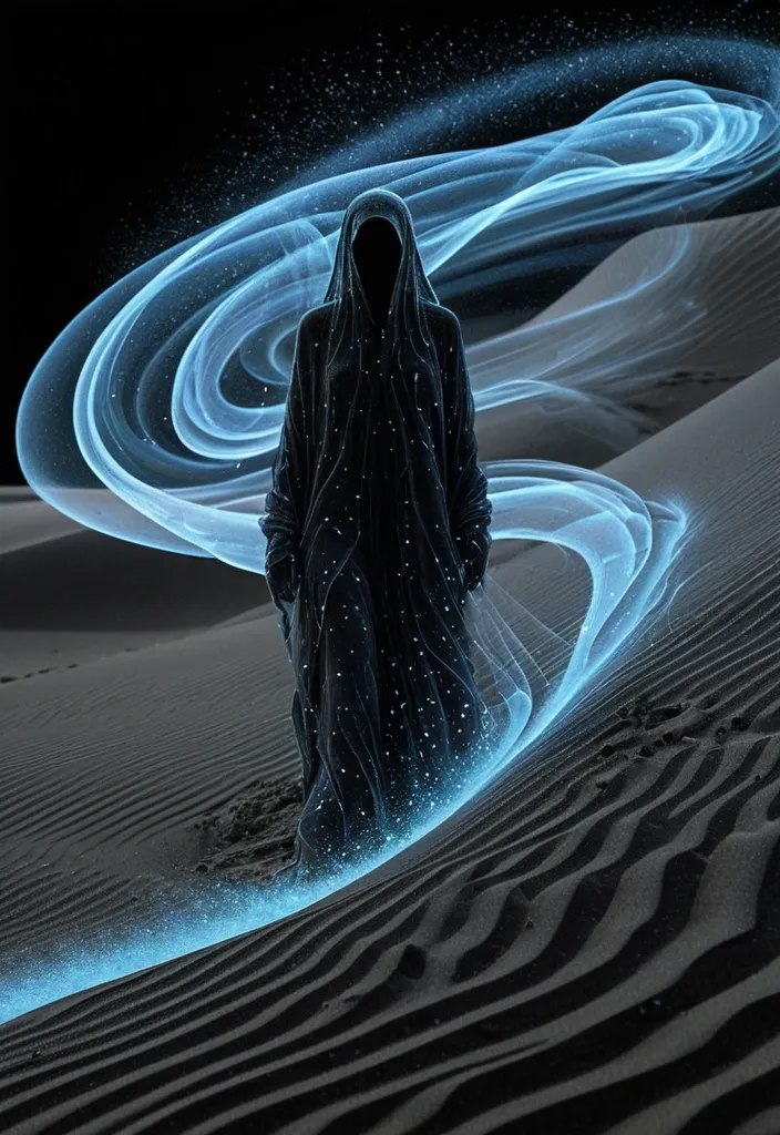 A surreal , Date-Palm trees spirals like a vortex towered sky , comprising dark black , warm gray , and deep white particles that dissolve into the dark sky. A female figure riding on camel , rendered in golden dots that reflect calmness , she in a gown of white and pinky particles that similarly fade into the darkness. The structure and gown emerged into the foreground , set against an desert sand backdrop. ,