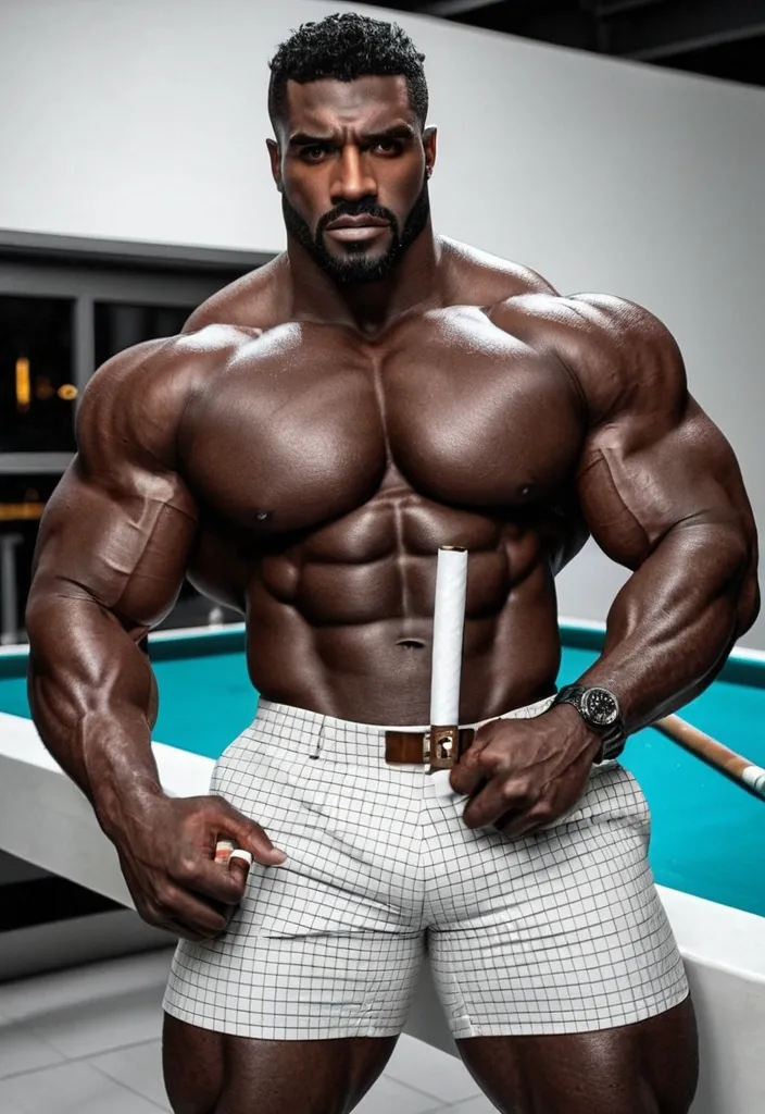 Generate ruggedly handsome dark-skinned African-American man abnormally massive male bodybuilder , , close up , full lips , big booty , black trimmed coarse hair , big , muscular man , brown strikingly intense and alluring eyes , up close , flexing biceps , beautiful brown eyes , legs are iconic and defining physical feature , both visually and in terms of combat ability.wearing an outfit that is a striking blend of elegance , power , and femininity , designed to command attention in any room. The suit is tailored to perfection , hugging the wearer’s curves with precision while emphasizing a structured silhouette. The fabric itself is a refined grey tweed patterned with subtle white grid lines , giving the suit a texture that feels both sophisticated and modern. The blazer features broad blue lapels and gold button accents , adding a luxurious touch that elevates the look beyond typical business attire. The matching high-waisted trousers elongate the frame , further enhancing the poised and commanding effect of the ensemble.The styling choices amplify the boldness of the suit. The inner shirt is a silky , greybutton-down shirt that complements the tweed’s tone while introducing a masculine balance to the sharp tailoring of the jacket. The shirt peeks out neatly from under the blazer , maintaining elegance without drawing focus away from the suit’s commanding cut. Accessories are kept minimal yet intentional: a delicate layered gold necklace ad alpha leader of light and luxury without overpowering the outfit completing the commanding visual.Altogether , this look communicates a blend of authority and allure. It is business-ready yet fashion-forward , balancing corporate structure with vibrant femininity. The color palette blue , grey and gold avoids being overly delicate , instead embracing the richness of texture , structure , and presence. This is the kind of ensemble that speaks to ambition , sophistication , and personal style—ideal for someone who thrives in positions of influence but insists on expressing her individuality with bold elegance. It’s not just clothing—it’s a statement of power wrapped in grace. In luxury living legs that could crush a watermelon , skirt high boots are a bold and striking statement piece , crafted in glossy black patent leather that gives them a sleek , polished finish. Rising to just below the knee , the boots feature three adjustable buckle straps along the shaft , adding both edge and detail to their design. The towering stiletto heel , paired with a thick platform sole , creates an ultra-dramatic silhouette that elongates the leg and exudes power and confidence. With their combination of shine , height , and structure , these boots perfectly balance fierce femininity with high-fashion allure , gray and white grid lined suit jacket , white dress shirt , deep red tie , gray and white grid lined suit pants , playing pool smoking cigar ,