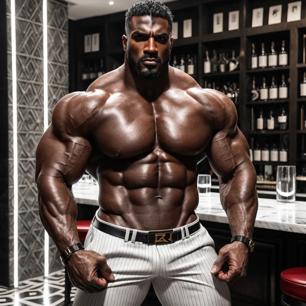 Generate ruggedly handsome dark-skinned African-American man abnormally massive male bodybuilder , , close up , full lips , big booty , black trimmed coarse hair , big , muscular man , brown strikingly intense and alluring eyes , up close , flexing biceps , beautiful brown eyes , legs are iconic and defining physical feature , both visually and in terms of combat ability.wearing an outfit that is a striking blend of elegance , power , and femininity , designed to command attention in any room. The suit is tailored to perfection , hugging the wearer’s curves with precision while emphasizing a structured silhouette. The fabric itself is a refined grey tweed patterned with subtle white grid lines , giving the suit a texture that feels both sophisticated and modern. The blazer features broad blue lapels and gold button accents , adding a luxurious touch that elevates the look beyond typical business attire. The matching high-waisted trousers elongate the frame , further enhancing the poised and commanding effect of the ensemble.The styling choices amplify the boldness of the suit. The inner shirt is a silky , greybutton-down shirt that complements the tweed’s tone while introducing a masculine balance to the sharp tailoring of the jacket. The shirt peeks out neatly from under the blazer , maintaining elegance without drawing focus away from the suit’s commanding cut. Accessories are kept minimal yet intentional: a delicate layered gold necklace ad alpha leader of light and luxury without overpowering the outfit completing the commanding visual.Altogether , this look communicates a blend of authority and allure. It is business-ready yet fashion-forward , balancing corporate structure with vibrant femininity. The color palette blue , grey and gold avoids being overly delicate , instead embracing the richness of texture , structure , and presence. This is the kind of ensemble that speaks to ambition , sophistication , and personal style—ideal for someone who thrives in positions of influence but insists on expressing her individuality with bold elegance. It’s not just clothing—it’s a statement of power wrapped in grace. In luxury living legs that could crush a watermelon , skirt high boots are a bold and striking statement piece , crafted in glossy black patent leather that gives them a sleek , polished finish. Rising to just below the knee , the boots feature three adjustable buckle straps along the shaft , adding both edge and detail to their design. The towering stiletto heel , paired with a thick platform sole , creates an ultra-dramatic silhouette that elongates the leg and exudes power and confidence. With their combination of shine , height , and structure , these boots perfectly balance fierce femininity with high-fashion allure , gray and white grid lined suit jacket , white dress shirt , deep red tie , gray and white grid lined suit pants , playing cards in beautiful hotel bar , smoking cigar ,