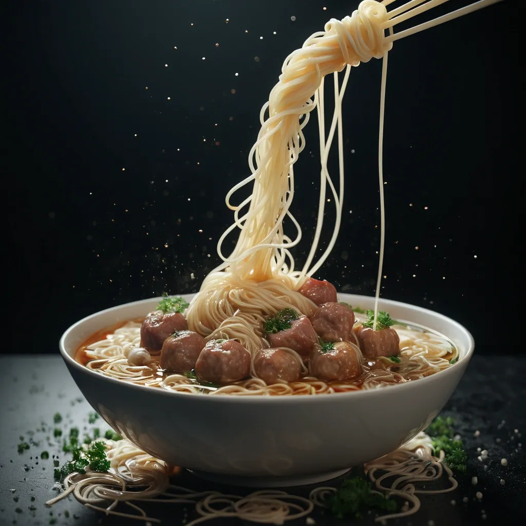 Ultra-realistic cinematic food photography of a bowl of noodle soup with long noodles lifting upward in a dramatic motion , clear broth splashing in elegant swirling ribbons around the noodles , meatballs , diced meat , herbs and crispy toppings floating mid-air , dynamic liquid splash , dark studio background , high-speed food photography , steam rising , macro detail on noodles and broth texture , gourmet restaurant advertisement style , hyper-realistic liquid physics , shallow depth of field , 8K. ,