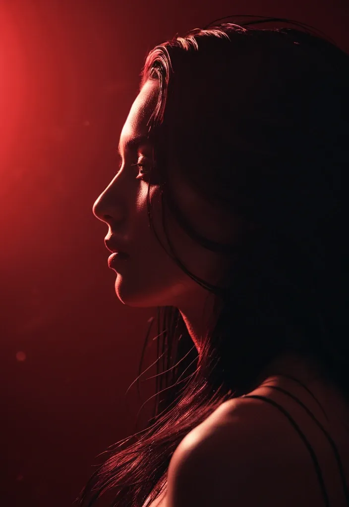 profile angle of A mystical woman's face , partially obscured by flowing raven hair , is captured in a fashion editorial style. Her eyes gleam with an intense , life-like shine against a deep , velvety red background. Professional photography captures the scene with a cinematic angle , utilizing dynamic backlighting to accentuate her features and create a halo effect. Rendered in hyperrealistic detail with a high-resolution finish , evoking the dramatic lighting and sharp focus of a modern magazine cover. ar-9:16 ,