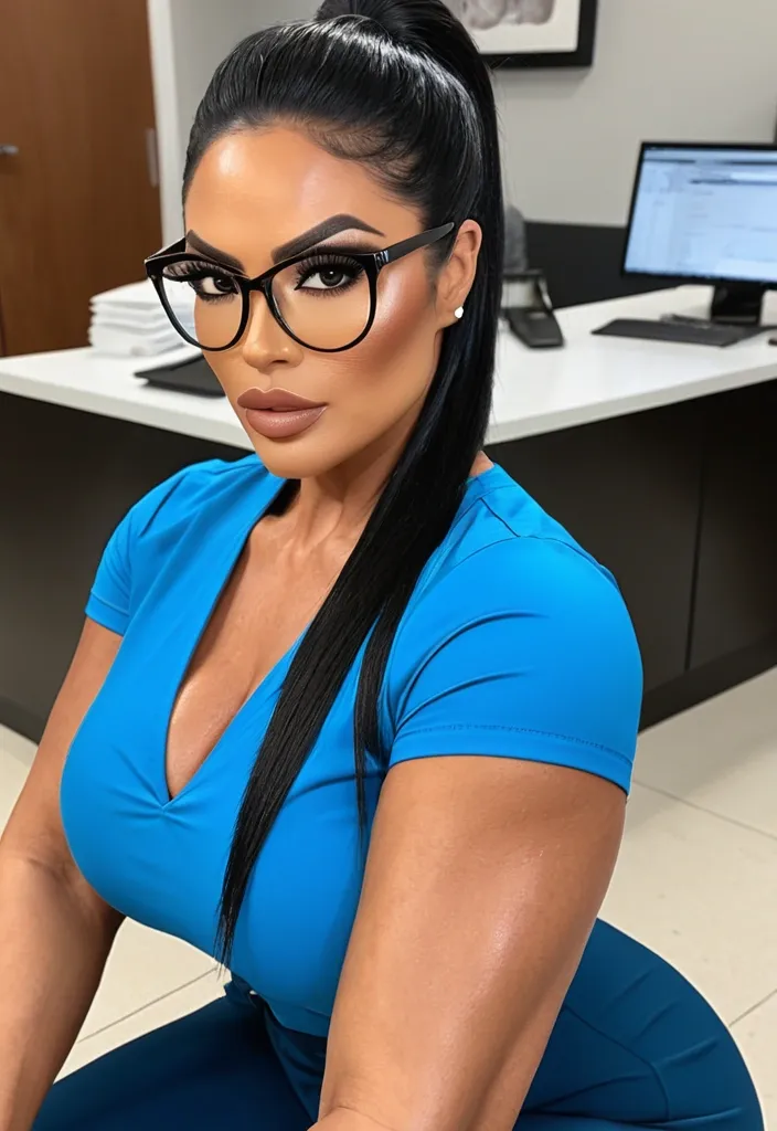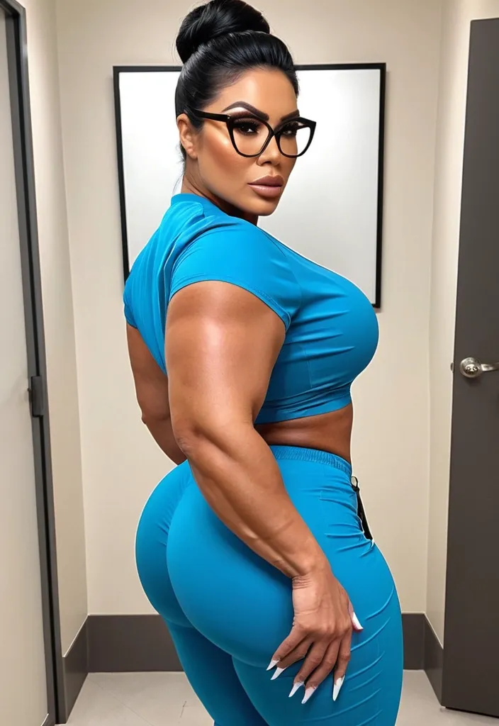 Generate Gorgeous female nurse , bimbo , hourglass body , golden brown skin complexion. abnormally massive female bodybuilder , gorgeous , close up , full lips , big booty , black hair , eye glasses , Philippine woman , black pompadour stylish hair , feminine silhouette , too big breast , big booty , sexy thighs abs , silhouette , up close , flexing biceps , beautiful green eyes , legs are iconic and defining physical feature , both visually and in terms of combat ability.wearing an outfit that is a striking blend of elegance , power , and femininity , designed to command attention in any room. The suit is tailored to perfection , hugging the wearer’s curves with precision while emphasizing a structured silhouette. The fabric itself is a refined grey tweed patterned with subtle white grid lines , giving the suit a texture that feels both sophisticated and modern. The blazer features broad blue lapels and gold button accents , adding a luxurious touch that elevates the look beyond typical business attire. The matching high-waisted trousers elongate the frame , further enhancing the poised and commanding effect of the ensemble.The styling choices amplify the boldness of the suit. The inner blouse is a silky , greybutton-down shirt that complements the tweed’s tone while introducing a softer , feminine balance to the sharp tailoring of the jacket. The blouse peeks out neatly from under the blazer , maintaining elegance without drawing focus away from the suit’s commanding cut. Accessories are kept minimal yet intentional: a delicate layered gold necklace and hoop earrings that add glimmers of light and luxury without overpowering the outfit. The choice of voluminous , honey-brown braids cascading down her shoulders frames the face with both confidence and glamour , completing the commanding visual.Altogether , this look communicates a blend of authority and allure. It is business-ready yet fashion-forward , balancing corporate structure with vibrant femininity. The color palette blue , grey and gold avoids being overly delicate , instead embracing the richness of texture , structure , and presence. This is the kind of ensemble that speaks to ambition , sophistication , and personal style—ideal for someone who thrives in positions of influence but insists on expressing her individuality with bold elegance. It’s not just clothing—it’s a statement of power wrapped in grace. In luxury living legs that could crush a watermelon , skirt high boots are a bold and striking statement piece , crafted in glossy black patent leather that gives them a sleek , polished finish. Rising to just below the knee , the boots feature three adjustable buckle straps along the shaft , adding both edge and detail to their design. The towering stiletto heel , paired with a thick platform sole , creates an ultra-dramatic silhouette that elongates the leg and exudes power and confidence. With their combination of shine , height , and structure , these boots perfectly balance fierce femininity with high-fashion allure. High cheekbones , prominent jawline , gorgeous big light brown eyes , powerful curves , enormous breast , standing in doctors office in blue scrubs , scrub top , scrub pants , voluptuous , up close shot , gorgeous light brown eyes , bending over arched back ,