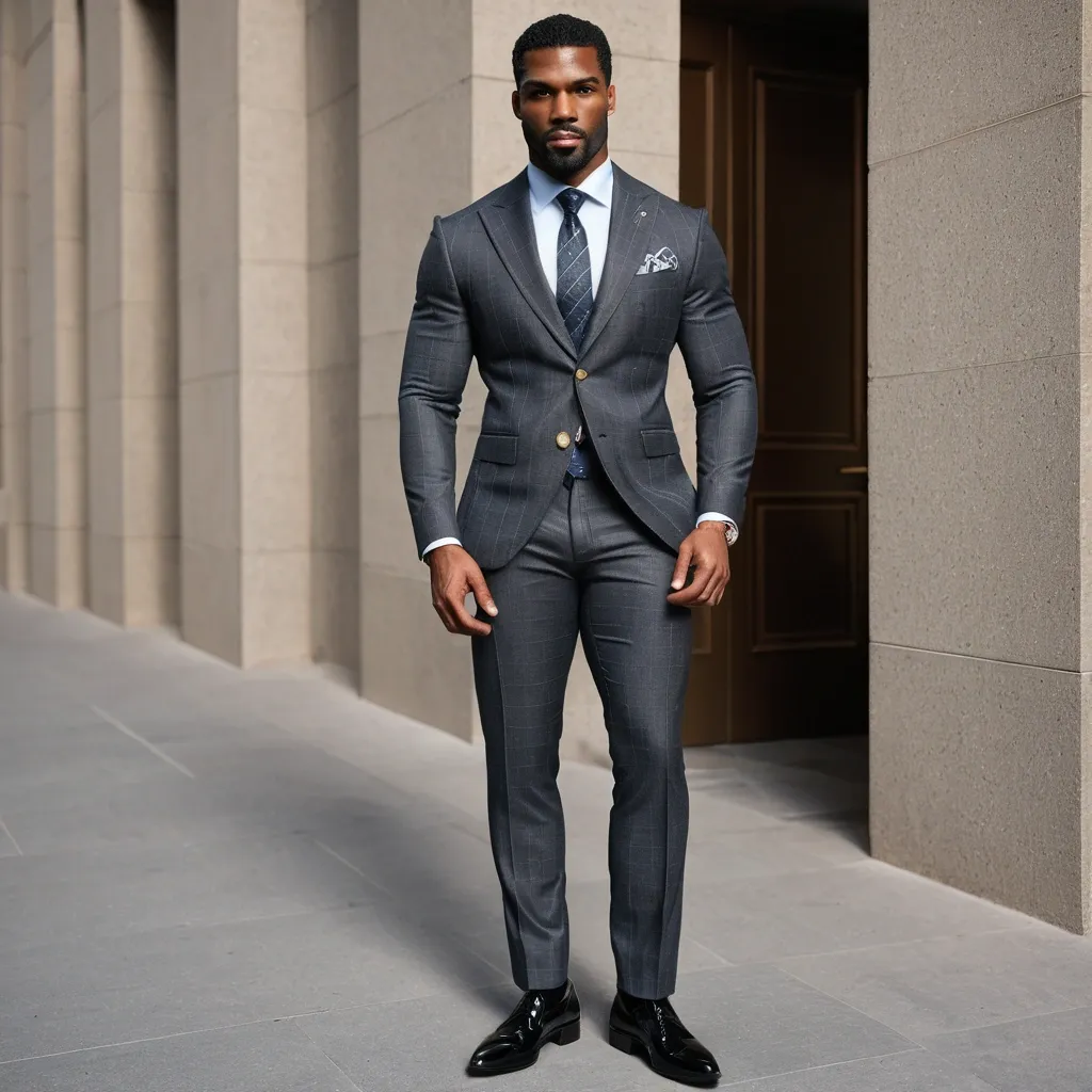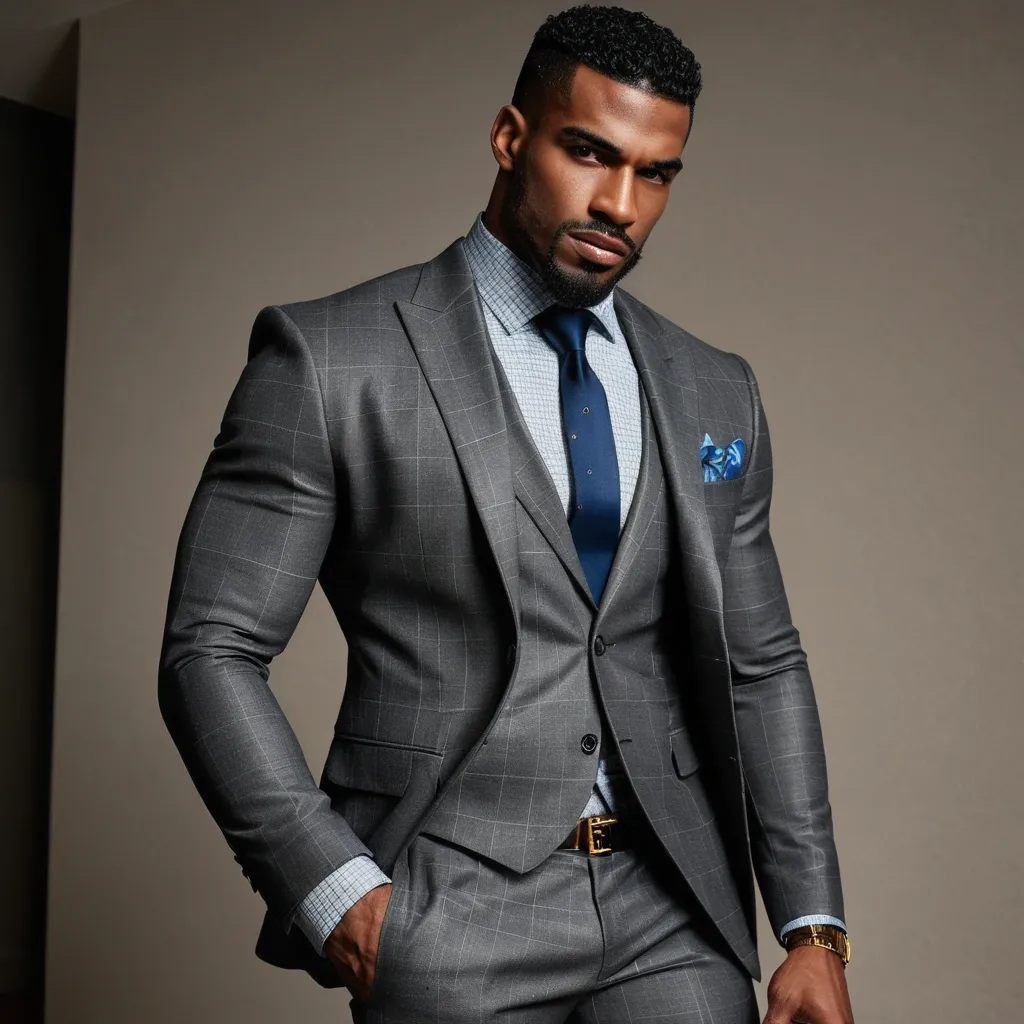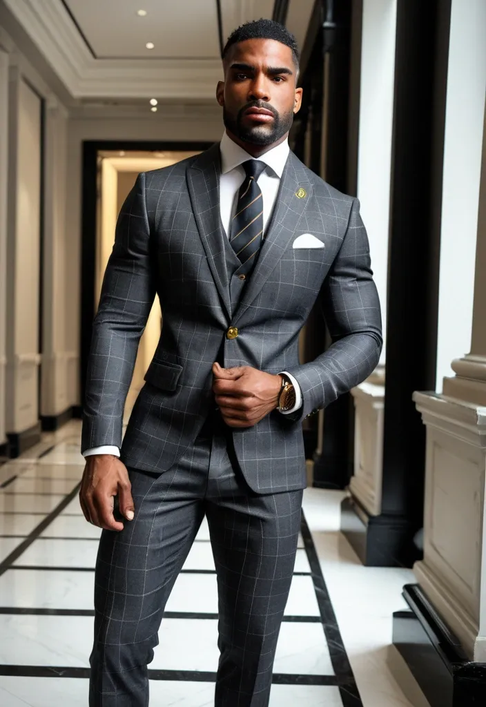 Generate a muscular African-American man , He is strikingly good looks , he is suave and a handsome debonair man abnormally massive male bodybuilder , close up , full lips , brown trimmed coarse hair , big brown gorgeous eyes , Brown coarse hair , muscular man , big gorgeous brow eyes , he is a well trimmed beard , strong jawline up close , sharp and prominent jaw and chin flexing biceps , gorgeous brown eyes , legs are iconic and defining physical feature , both visually and in terms of combat ability.wearing an outfit that is a striking blend of suaveness , power , and alpha male indulgence , designed to command attention in any room. The suit is tailored to perfection , hugging the wearer’s manly physique with precision while emphasizing a structured silhouette. The fabric itself is a refined grey tweed patterned with subtle white grid lines , giving the suit a texture that feels both sophisticated and modern. The blazer features broad blue lapels and gold button accents , adding a luxurious touch that elevates the look beyond typical business attire. The matching trousers elongate the frame , further enhancing the poised and commanding effect of the ensemble.The styling choices amplify the boldness of the suit. The inner shirt is a silky , grey button-down shirt that complements the tweed’s tone while introducing a masculine balance to the sharp tailoring of the jacket. The shirt peeks out neatly from under the blazer , maintaining elegance without drawing focus away from the suit’s commanding cut. Accessories are kept minimal yet intentional: a delicate layered gold necklace ad alpha leader of light and luxury without overpowering the outfit completing the commanding visual.Altogether , this look communicates a blend of authority and allure. It is business-ready yet fashion-forward , balancing corporate structure with masculine swagger . The color palette blue , grey and gold avoids being overly delicate , instead embracing the richness of texture , structure , and presence. This is the kind of ensemble that speaks to ambition , sophistication , and personal style—ideal for someone who thrives in positions of influence but insists on expressing hid individuality with bold elegance. It’s not just clothing—it’s a statement of power wrapped in mojo. In luxury living legs that could crush a watermelon , chest like boulders are a bold , crafted in glossy black patent leather that gives them a sleek , polished finish. Rising to just below the knee , the shoes feature three adjustable buckle straps along the shaft , adding both edge and detail to their design. The towering males , creates an ultra-dramatic masculine silhouette that elongates the leg and exudes power and confidence. With their combination of shine , height , and structure , his lean body perfectly balance fierce masculinity with high alpha male allure , a bodybuilder male , muscular man ,