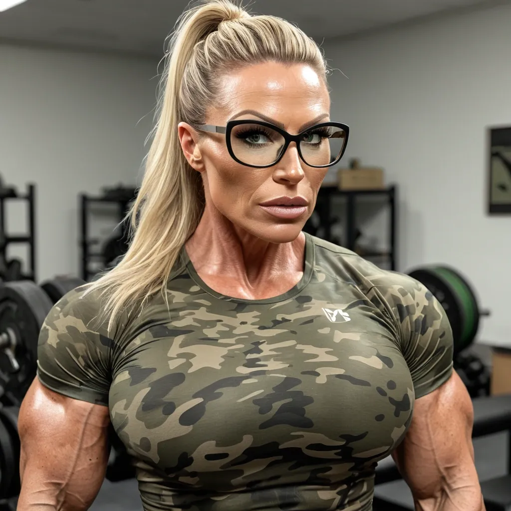 42 years old , Generate Gorgeous female physical fitness trainer , bimbo , circle eye glasses hourglass body , abnormally massive female bodybuilder , gorgeous , close up , full lips , big booty , hair in ponytail , freckles , dirty blonde hair , short hair feminine silhouette , too big breast , big booty , sexy thighs abs , silhouette , up close , flexing biceps , gorgeous light brown eyes , legs are iconic and defining physical feature , both visually and in terms of combat ability.wearing an outfit that is a striking blend of elegance , power , and femininity , designed to command attention in any room. The suit is tailored to perfection , hugging the wearer’s curves with precision while emphasizing a structured silhouette. The fabric itself is a refined grey tweed patterned with subtle white grid lines , giving the suit a texture that feels both sophisticated and modern. The blazer features broad blue lapels and gold button accents , adding a luxurious touch that elevates the look beyond typical business attire. The matching high-waisted trousers elongate the frame , further enhancing the poised and commanding effect of the ensemble.The styling choices amplify the boldness of the suit. The inner blouse is a silky , greybutton-down shirt that complements the tweed’s tone while introducing a softer , feminine balance to the sharp tailoring of the jacket. The blouse peeks out neatly from under the blazer , maintaining elegance without drawing focus away from the suit’s commanding cut. Accessories are kept minimal yet intentional: a delicate layered gold necklace and hoop earrings that add glimmers of light and luxury without overpowering the outfit. The choice of voluminous , honey-brown braids cascading down her shoulders frames the face with both confidence and glamour , completing the commanding visual.Altogether , this look communicates a blend of authority and allure. It is business-ready yet fashion-forward , balancing corporate structure with vibrant femininity. The color palette blue , grey and gold avoids being overly delicate , instead embracing the richness of texture , structure , and presence. This is the kind of ensemble that speaks to ambition , sophistication , and personal style—ideal for someone who thrives in positions of influence but insists on expressing her individuality with bold elegance. It’s not just clothing—it’s a statement of power wrapped in grace. In luxury living legs that could crush a watermelon , skirt high boots are a bold and striking statement piece , crafted in glossy black patent leather that gives them a sleek , polished finish. Rising to just below the knee , the boots feature three adjustable buckle straps along the shaft , adding both edge and detail to their design. The towering stiletto heel , paired with a thick platform sole , creates an ultra-dramatic silhouette that elongates the leg and exudes power and confidence. With their combination of shine , height , and structure , these boots perfectly balance fierce femininity with high-fashion allure. High cheekbones , prominent jawline , gorgeous big light reflecting dark green eyes , brown-shirt , camouflage pants , in military office freckles ,