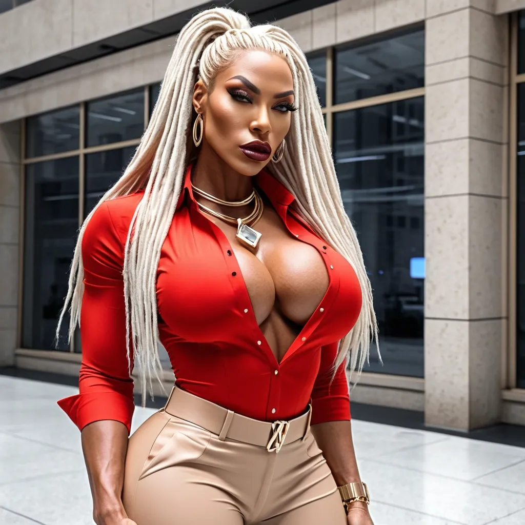 Generate Gorgeous , female boss , light-skinned African-American woman , pointy face , bimbo , hourglass body , abnormally massive female bodybuilder , dreadlocks gorgeous , close up , full lips , big booty , blonde hair , feminine silhouette , too big breast , big booty , sexy thighs abs , silhouette , up close , dreadlocks , flexing biceps , gorgeous hazel eyes , legs are iconic and defining physical feature , both visually and in terms of combat ability.wearing an outfit that is a striking blend of elegance , power , and femininity , designed to command attention in any room. The suit is tailored to perfection , hugging the wearer’s curves with precision while emphasizing a structured silhouette. The fabric itself is a refined grey tweed patterned with subtle white grid lines , giving the suit a texture that feels both sophisticated and modern. The blazer features broad blue lapels and gold button accents , adding a luxurious touch that elevates the look beyond typical business attire. The matching high-waisted trousers elongate the frame , further enhancing the poised and commanding effect of the ensemble.The styling choices amplify the boldness of the suit. The inner blouse is a silky , greybutton-down shirt that complements the tweed’s tone while introducing a softer , feminine balance to the sharp tailoring of the jacket. The blouse peeks out neatly from under the blazer , maintaining elegance without drawing focus away from the suit’s commanding cut. Accessories are kept minimal yet intentional: a delicate layered gold necklace and hoop earrings that add glimmers of light and luxury without overpowering the outfit. The choice of voluminous , honey-brown braids cascading down her shoulders frames the face with both confidence and glamour , completing the commanding visual.Altogether , this look communicates a blend of authority and allure. It is business-ready yet fashion-forward , balancing corporate structure with vibrant femininity. The color palette blue , grey and gold avoids being overly delicate , instead embracing the richness of texture , structure , and presence. This is the kind of ensemble that speaks to ambition , sophistication , and personal style—ideal for someone who thrives in positions of influence but insists on expressing her individuality with bold elegance. It’s not just clothing—it’s a statement of power wrapped in grace. In luxury living legs that could crush a watermelon , skirt high boots are a bold and striking statement piece , crafted in glossy black patent leather that gives them a sleek , polished finish. Rising to just below the knee , the boots feature three adjustable buckle straps along the shaft , adding both edge and detail to their design. The towering stiletto heel , paired with a thick platform sole , creates an ultra-dramatic silhouette that elongates the leg and exudes power and confidence. With their combination of shine , height , and structure , these boots perfectly balance fierce femininity with high-fashion allure. High cheekbones , prominent jawline , gorgeous hazel eyes , enormous breast , futuristic red designer oxford shirt , chocolate diamond futuristic necklace , beige designer pants in office building ,