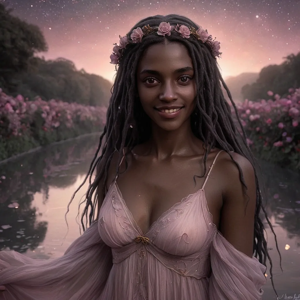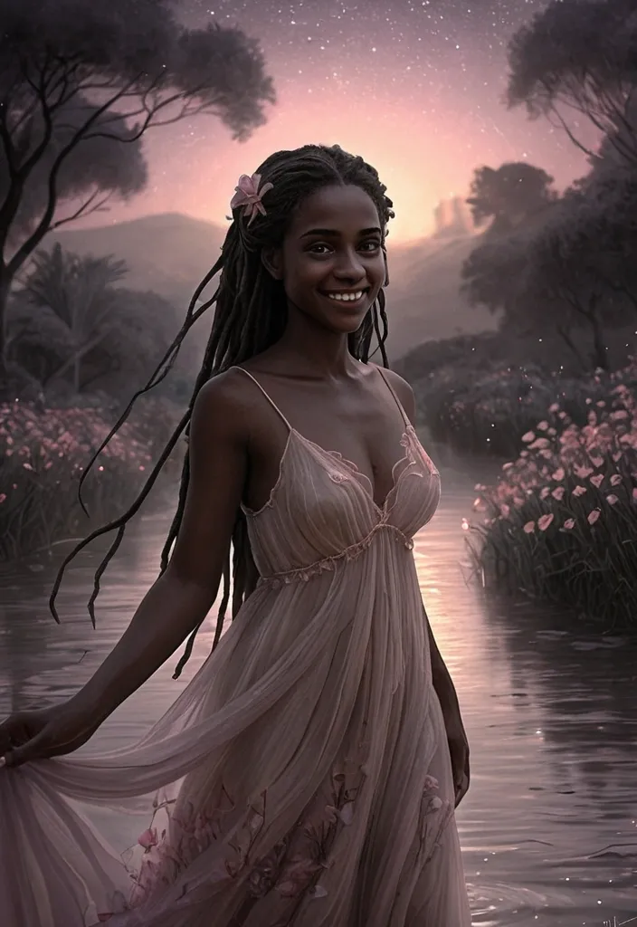 Artstation , Drawing , Graphite , Charcoal Art , "Illustration: A dreamlike scene bathed in soft , ethereal light , representing a cherished memory. The focus is on a woman with dark skin , long , flowing dark dreadlocks ('um rio de ébano a deslizar' - a river of ebony sliding down) , and naturally red eyes that hold a universe of emotion ('Em seus olhos , o universo inteiro a se revelar' - In her eyes , the entire universe is revealed). She is wearing a delicate , flowing dress that resembles a blooming flower ('Seu vestido , a pétala de uma flor a desabrochar' - Her dress , the petal of a flower blooming). Her smile is radiant and carries the promise of eternal love ('E em seu sorriso , a promessa de um eterno amar' - And in her smile , the promise of an eternal love). The background is soft and blurred , hinting at a beautiful garden or a starlit sky. The overall mood is one of longing , nostalgia , and idealized beauty. The style is romantic and ethereal , reminiscent of a Pre-Raphaelite painting or a dream sequence in a classic film. The color palette is soft and pastel , with gentle hues of pink , purple , and gold dominating. The scene should evoke a sense of timeless beauty and the bittersweet feeling of remembering a perfect moment." ,