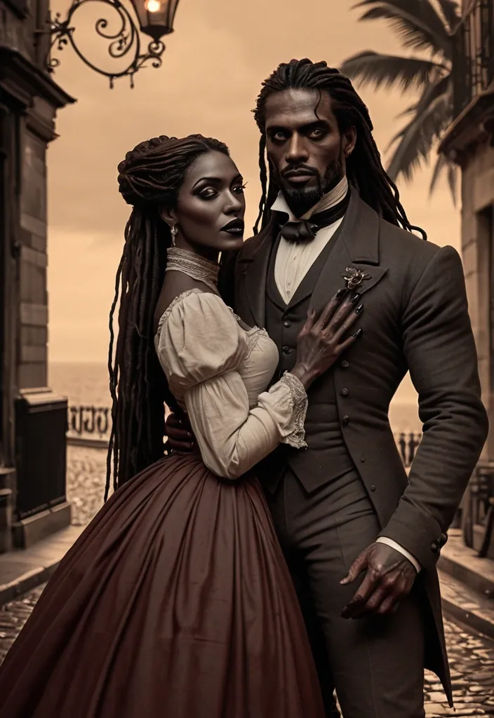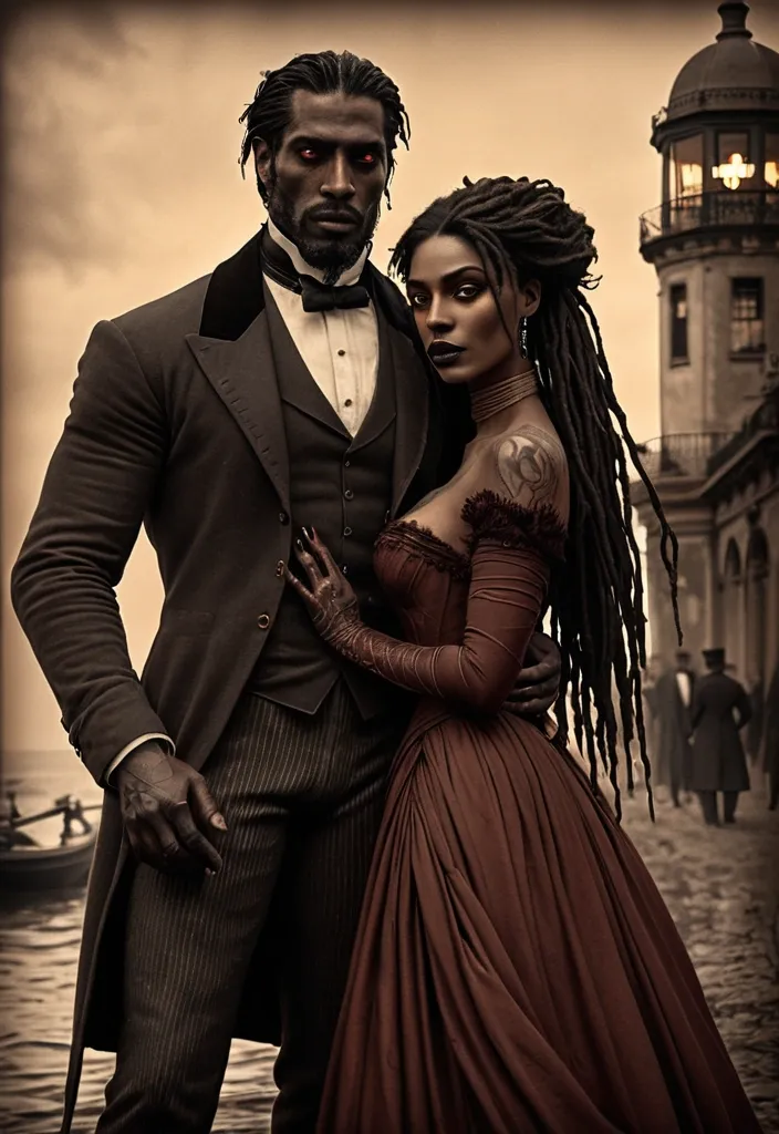 Artstation , Drawing , Graphite , Charcoal Art , "Illustration: A vintage-toned scene evoking the year 1900. A woman with dark skin , long dark dreadlocks , and striking eyes with reddish irises (similar to that of a vampire) is seen in the arms of a man with dark skin , dreadlocks , and striking eyes with a wolf-like coloration. They are dressed in the fashion of the era – she in a long , elegant gown , he in a tailored suit. They are bathed in the warm glow of gaslight , suggesting a romantic encounter in a bygone era. The background is softly blurred , hinting at a grand ballroom or a Parisian café. Their expressions are filled with youthful love and optimism. The overall mood is one of hope and the beginning of a timeless romance. The style is reminiscent of early 20th-century photography or a vintage postcard. The color palette is sepia-toned with subtle hints of color , creating a sense of nostalgia. This scene represents the 'farol na escuridão' (lighthouse in the darkness) and the 'chama que aquece o coração' (flame that warms the heart) at the beginning of their long and enduring , yet ultimately tragic , love story. Subtle visual cues should hint at their immortality , perhaps a timeless quality in their eyes or a subtle anachronism in the background." ,