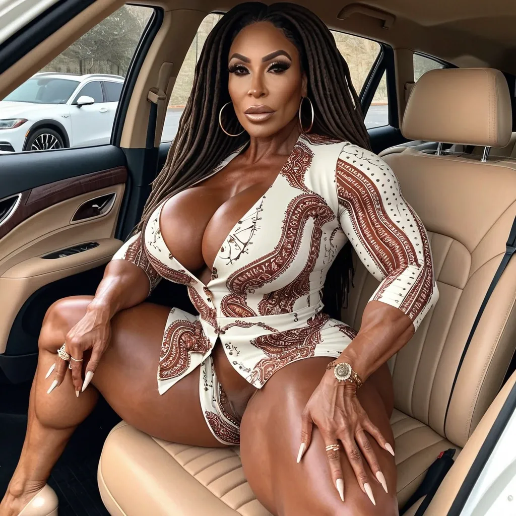 Gorgeous female boss , too big breast , stunning woman , stacked , enormous breast dark-skinned African-American woman , gorgeous brown eyes , 42 years old , abnormally massive female bodybuilder , gorgeous , close up , full lips , big booty , brown , hair , small waist , feminine silhouette , too big breast , beautiful brown eyes , dreadlocks , big booty , curvy hips , toned legs , muscular legs , flexing biceps , sitting in car , up facing the camera , She’s wearing a long , elegant paisley-patterned dress paired with a cream-colored buttoned cardigan , giving her a soft , cozy , bohemian feminine style. , enormous butt , massive breast , big round booty , , legs crosses , muscular legs ,