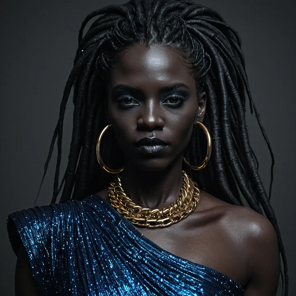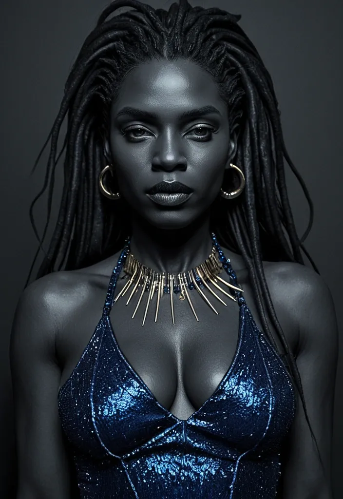 Artstation , Drawing , Graphite , Charcoal Art , "She is a mature and captivating blues singer , her presence commanding attention. Her dark skin carries the subtle marks of time , adding depth to her already expressive features. Her long , dark dreadlocks are styled in a way that speaks to both tradition and modern flair , framing her face with an effortless elegance. Her eyes , striking with their reddish irises (similar to that of a vampire) , hold a depth of experience and a hint of melancholy , reflecting the soul of the blues. She wears a form-fitting dress that hints at sensuality without sacrificing the authenticity of her blues persona. The dress might be a modern take on a classic blues silhouette – perhaps a shimmering , sequined gown with a daring neckline , or a sleek , velvet number with strategic cutouts. She accessorizes with bold , statement jewelry – chunky gold necklaces , stacks of bracelets , and large hoop earrings – that add a touch of glamour to her look. Her overall style is a blend of classic blues aesthetics and contemporary fashion , reflecting her status as a timeless artist who remains relevant in the modern world. Her voice is her most powerful asset – a raw , soulful instrument that conveys the pain , passion , and resilience of the blues." ,