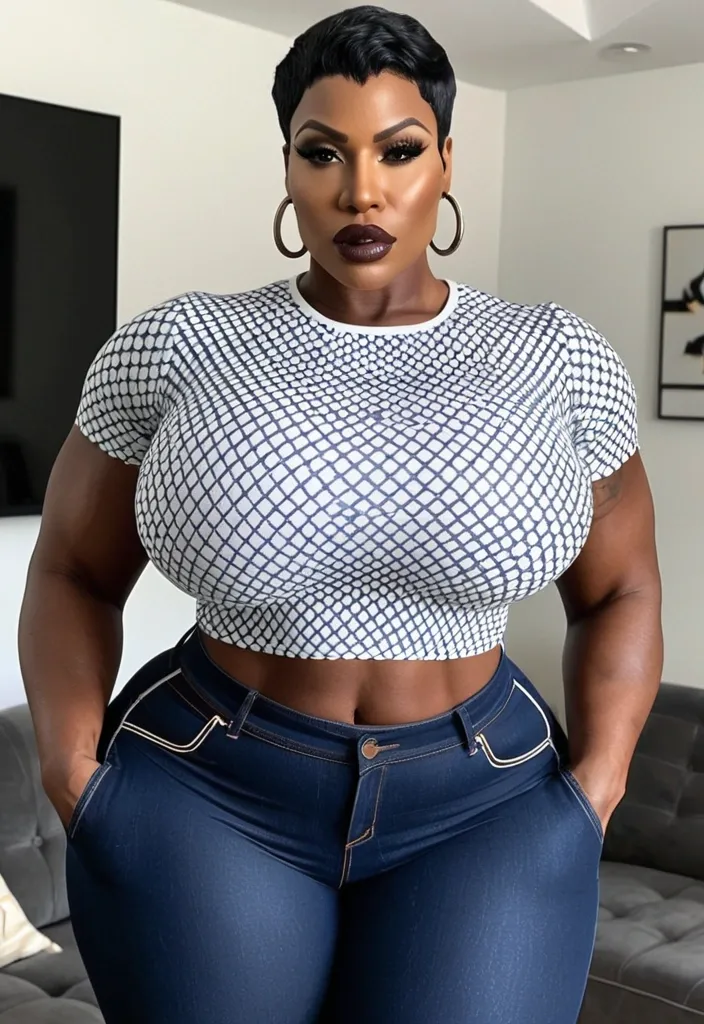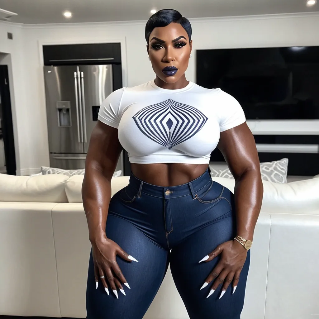 Generate Gorgeous female boss , bimbo , very dark-skinned African-American woman , short , pixie hair , hourglass body , abnormally massive female bodybuilder , gorgeous , close up , full lips , big booty , dark brown eyes , very big plump lips , feminine silhouette , too big breast , big booty , sexy thighs abs , silhouette , up close , flexing biceps , big gorgeous light brown eyes , legs are iconic and defining physical feature , both visually and in terms of combat ability.wearing an outfit that is a striking blend of elegance , power , and femininity , designed to command attention in any room. The suit is tailored to perfection , hugging the wearer’s curves with precision while emphasizing a structured silhouette. The fabric itself is a refined grey tweed patterned with subtle white grid lines , giving the suit a texture that feels both sophisticated and modern. The blazer features broad blue lapels and gold button accents , adding a luxurious touch that elevates the look beyond typical business attire. The matching high-waisted trousers elongate the frame , further enhancing the poised and commanding effect of the ensemble.The styling choices amplify the boldness of the suit. The inner blouse is a silky , greybutton-down shirt that complements the tweed’s tone while introducing a softer , feminine balance to the sharp tailoring of the jacket. The blouse peeks out neatly from under the blazer , maintaining elegance without drawing focus away from the suit’s commanding cut. Accessories are kept minimal yet intentional: a delicate layered gold necklace and hoop earrings that add glimmers of light and luxury without overpowering the outfit. The choice of voluminous , honey-brown braids cascading down her shoulders frames the face with both confidence and glamour , completing the commanding visual.Altogether , this look communicates a blend of authority and allure. It is business-ready yet fashion-forward , balancing corporate structure with vibrant femininity. The color palette blue , grey and gold avoids being overly delicate , instead embracing the richness of texture , structure , and presence. This is the kind of ensemble that speaks to ambition , sophistication , and personal style—ideal for someone who thrives in positions of influence but insists on expressing her individuality with bold elegance. It’s not just clothing—it’s a statement of power wrapped in grace. In luxury living legs that could crush a watermelon , skirt high boots are a bold and striking statement piece , crafted in glossy black patent leather that gives them a sleek , polished finish. Rising to just below the knee , the boots feature three adjustable buckle straps along the shaft , adding both edge and detail to their design. The towering stiletto heel , paired with a thick platform sole , creates an ultra-dramatic silhouette that elongates the leg and exudes power and confidence. With their combination of shine , height , and structure , these boots perfectly balance fierce femininity with high-fashion allure. Massive breast , massive cleavage , driving and standing in living room , wearing a white , dark navy blue and black accented subtle symmetrical patterned t-shirt , black denim pants , enormous butt ,