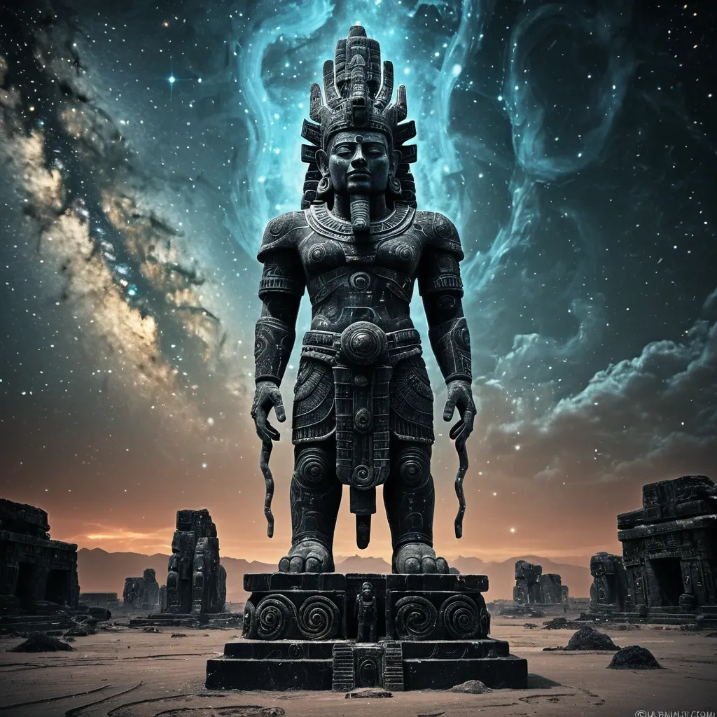 A colossal , ancient mayan statue of a forgotten cosmic deity , carved from obsidian and inlaid with stardust , stands sentinel on a barren , alien planet. Swirling nebulae paint the sky above , casting an ethereal glow. The style is a blend of dark fantasy concept art and abstract cosmic horror , reminiscent of Zdzisław Beksiński and H.R. Giger. ,